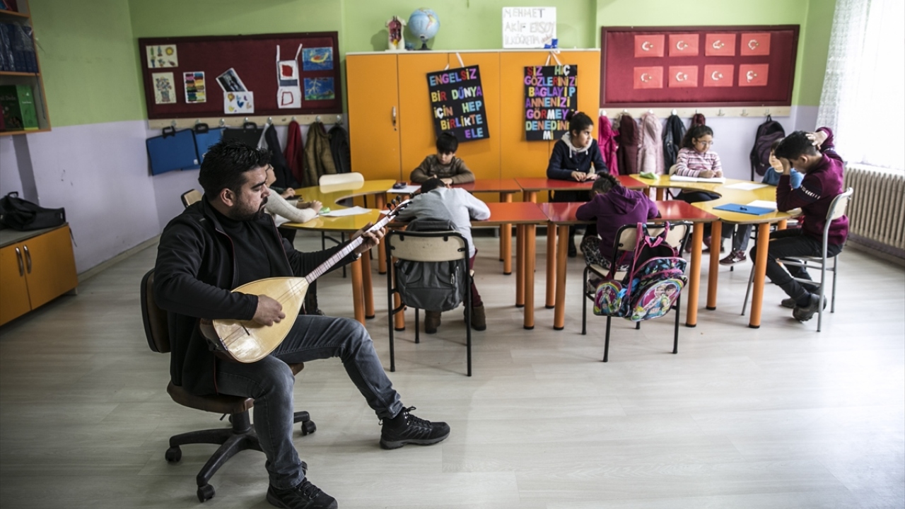 Hatay'daki bir ilkokulda görme engellilere öğretmenlik yapan Mehmet Avşar, öğrencilerin motivasyonunu artırmak için yazı ve boyama derslerini saz çalarak işliyor.