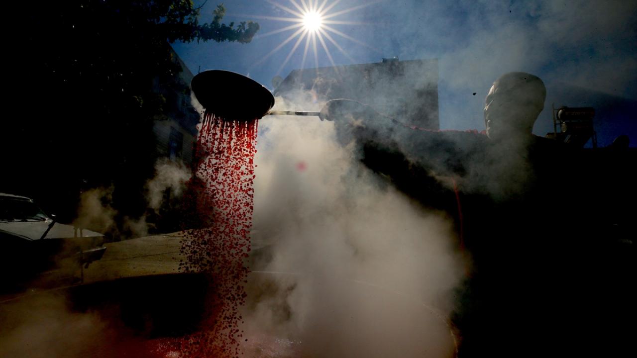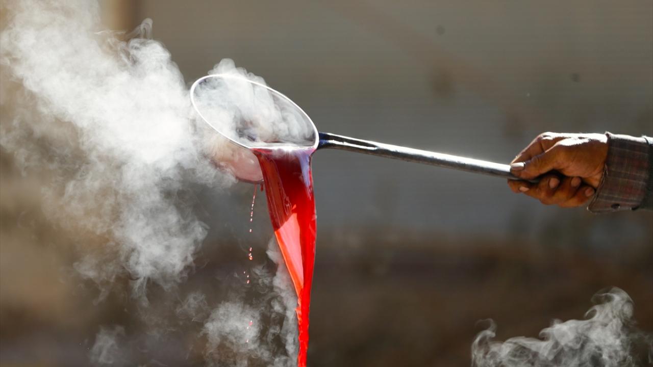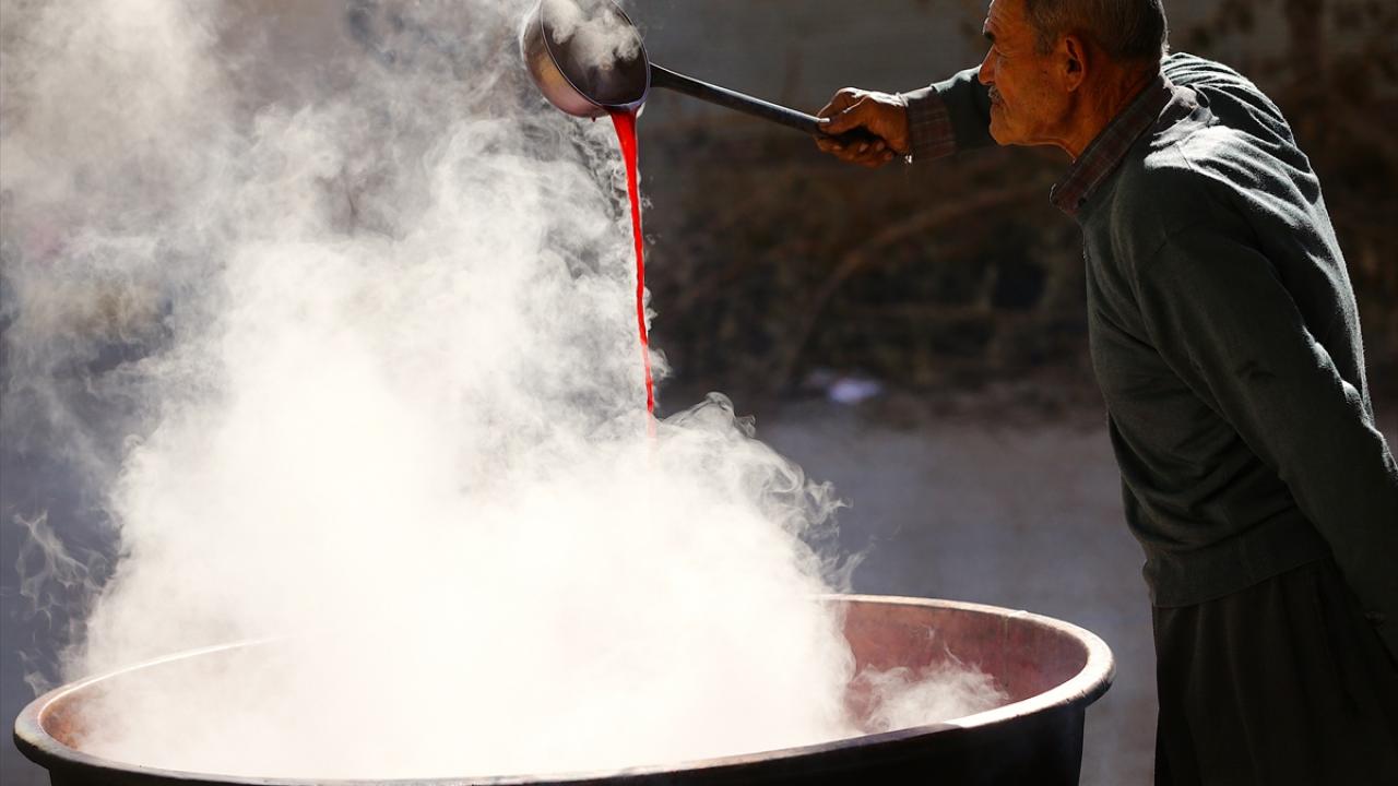 Dev kazanlara aktarılan nar suyu, binbir emek ve zahmetle, saatlerce süren kaynamanın ardından kıvama geldikten sonra soğuması için bidonlara aktarılıyor.