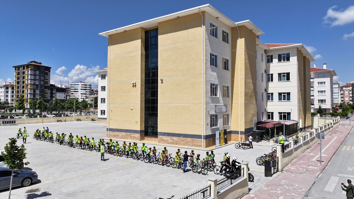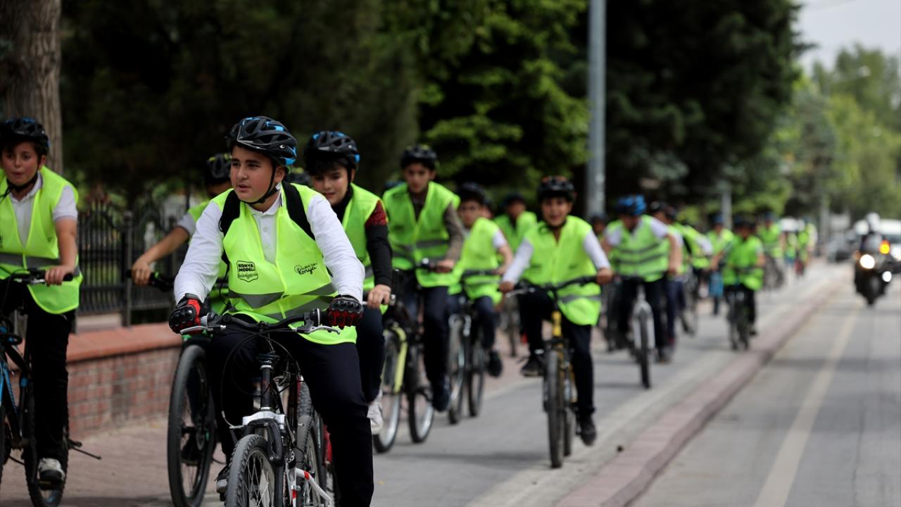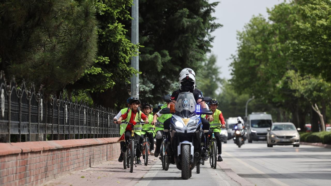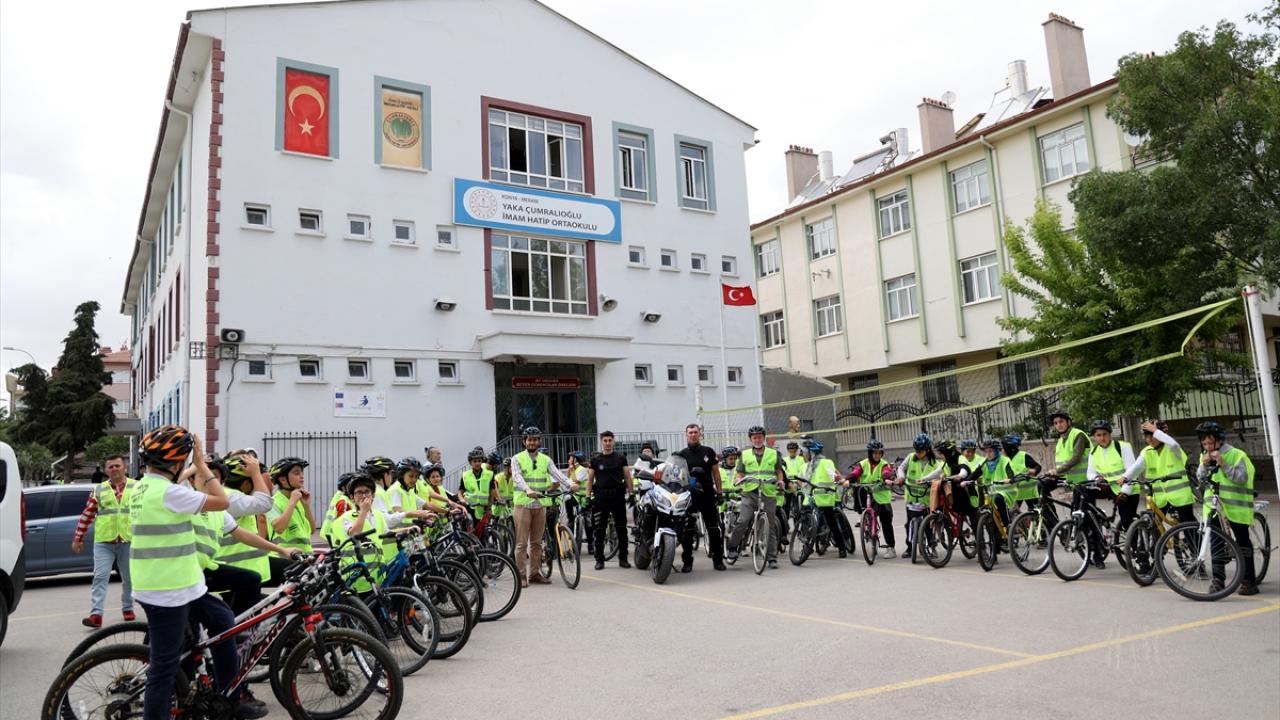 Türkiye'nin en uzun bisiklet yolu ağına sahip Konya'da hayata geçirilen projeyle motorize zabıtaların eşliğinde öğrenciler güvenli bisiklet yoluyla okula gidiyor.