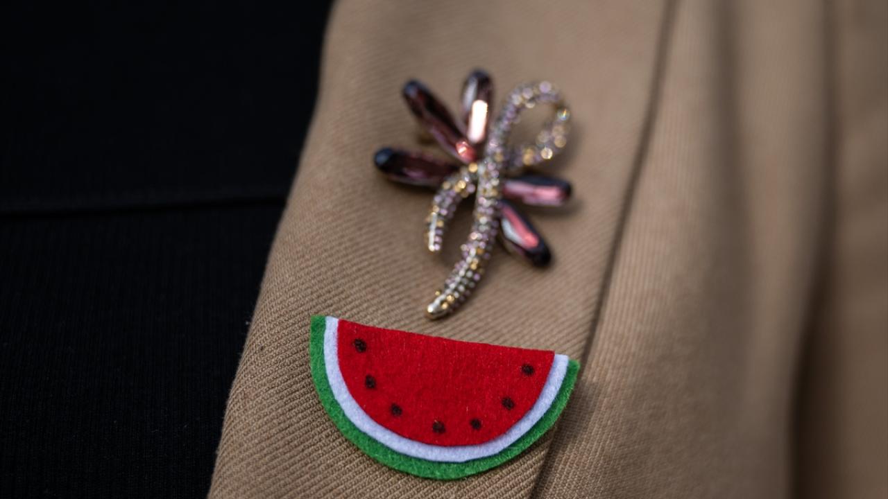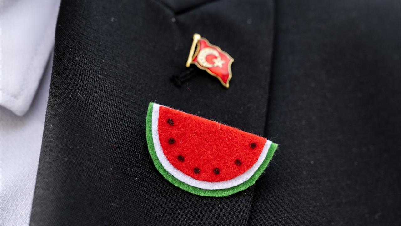 Öğrenciler, kalp şeklinde Filistin bayrağı ve "Özgür Filistin" yazılı yaka rozeti taktı.