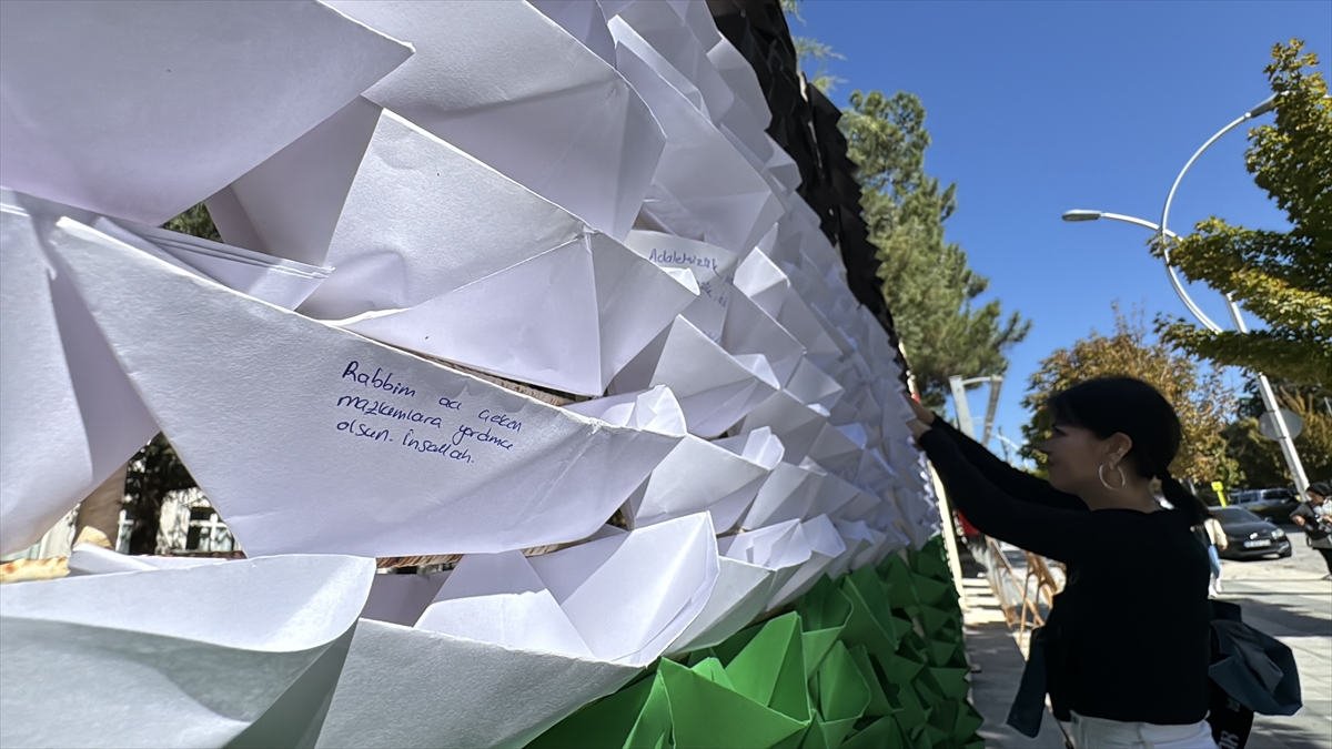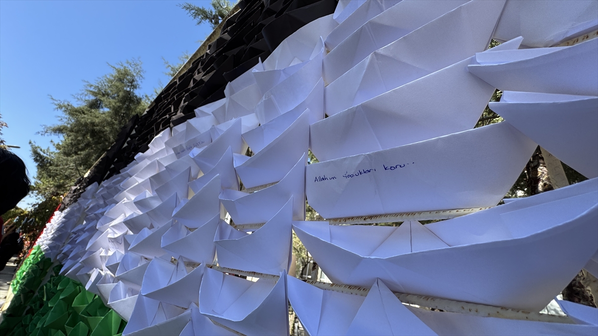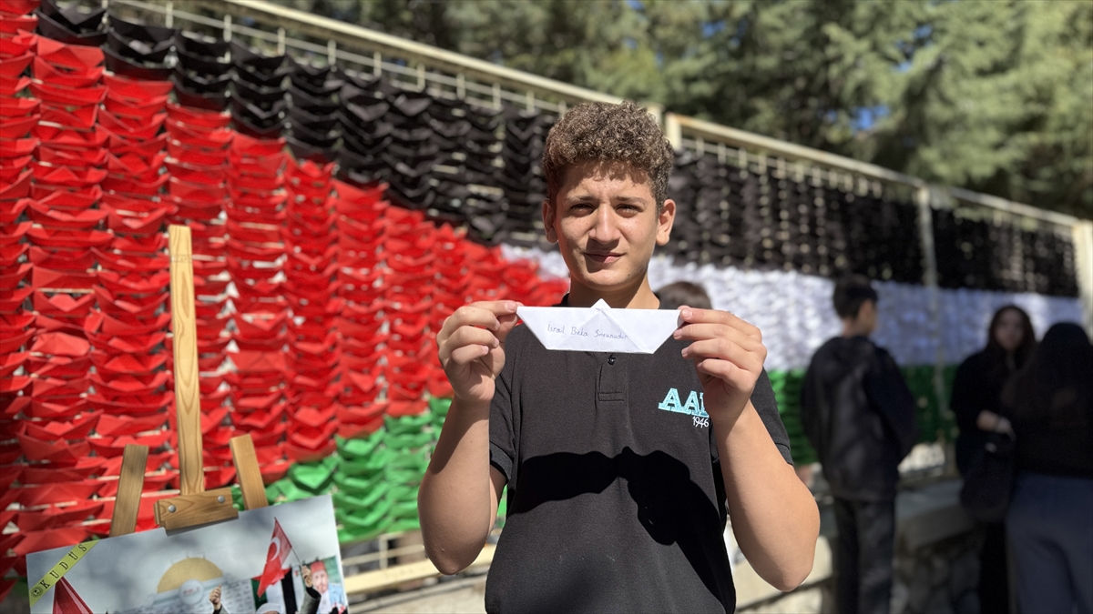 Kentin en işlek caddelerinden Gazi Caddesi`nde yer alan okulun önünde stant kuran öğrenciler, kaldırımdan geçen vatandaşlardan İsrail ve Filistin konusunda düşüncelerini gemi maketlerine yazmalarını istedi.