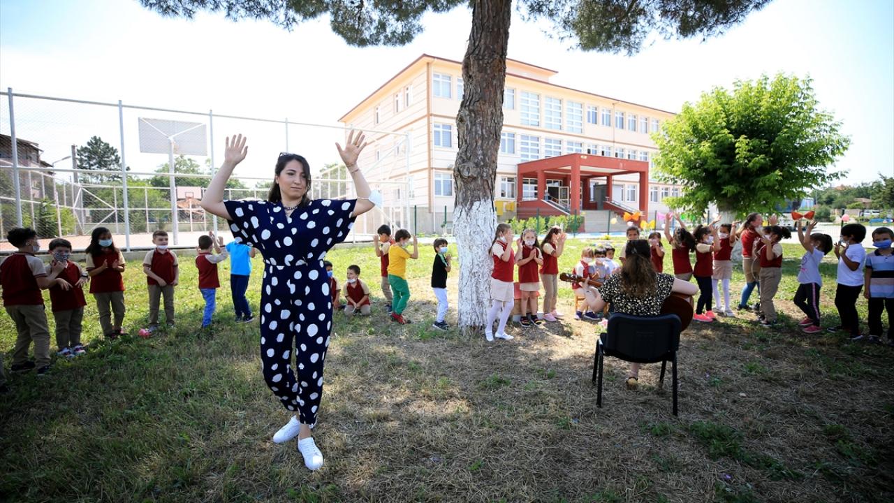 Öğrenciler öğretmenleriyle okul bahçesinde, oyun oynuyor, resim ve müzik etkinliklerine katılıyor.
