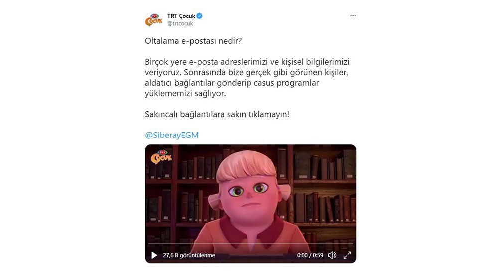 TRT Çocuk da hazırladığı çizgi filmlerde çocukları bilgilendirmek için oltalama e-postasının ne olduğunu anlatarak tıklamamaları konusunda uyarmıştı.