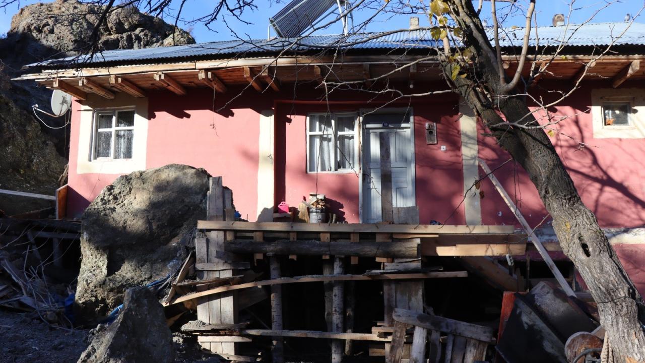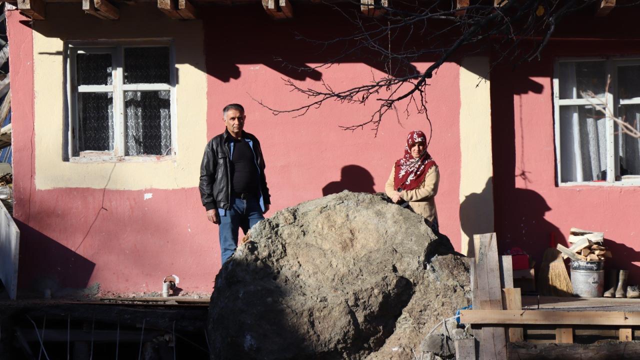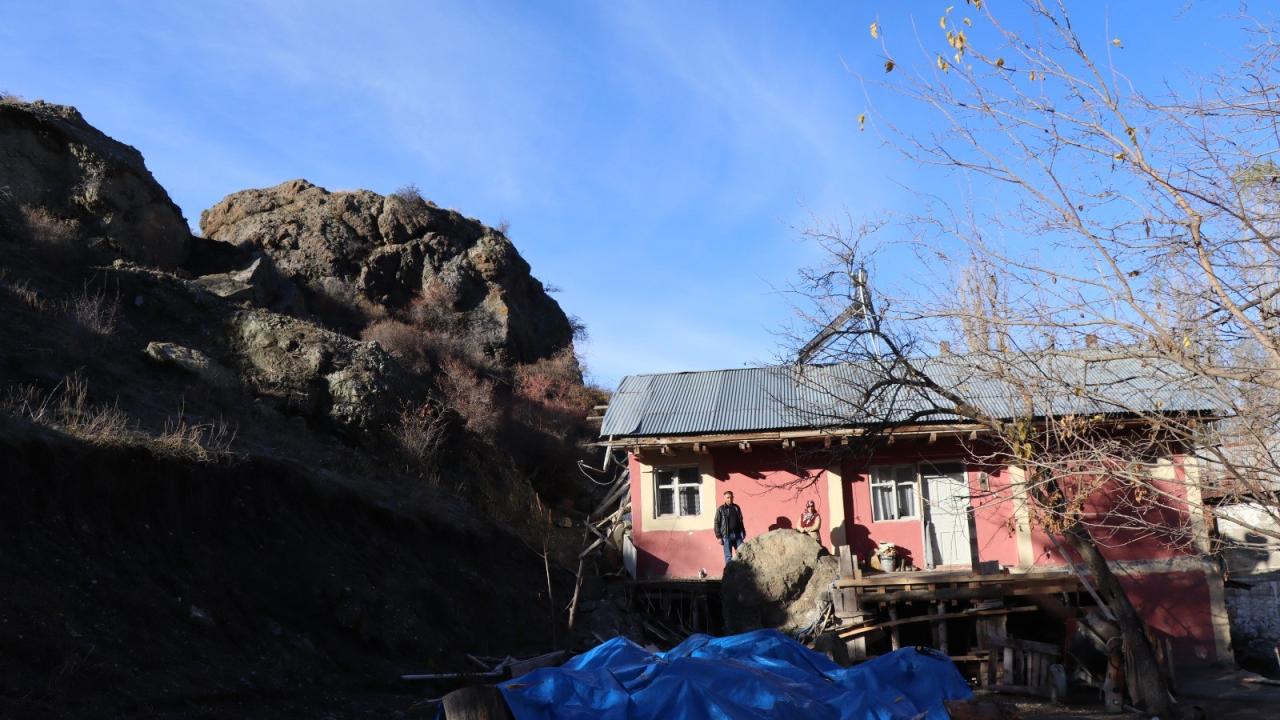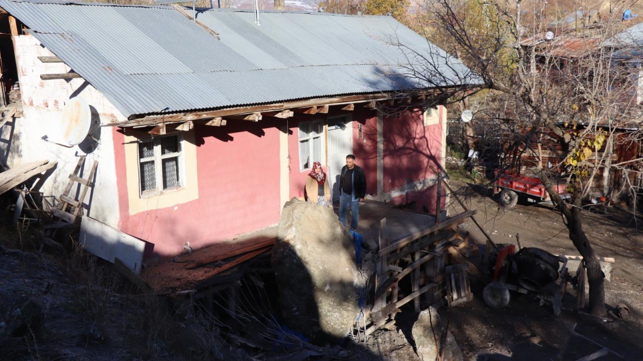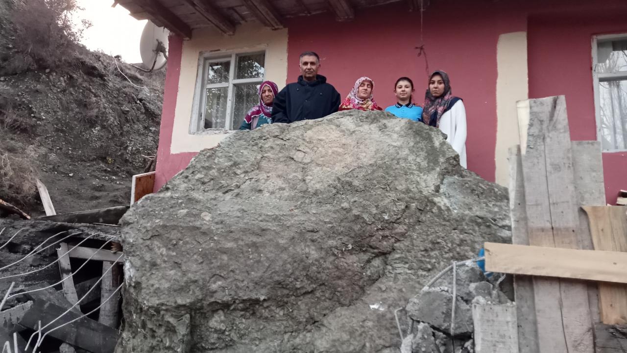 Kopan büyük kaya, Mahalle Muhtarı Bünyamin Yeşilyurt’un evine çarparak durdu. Evin balkonunda büyük hasara yol açtı.