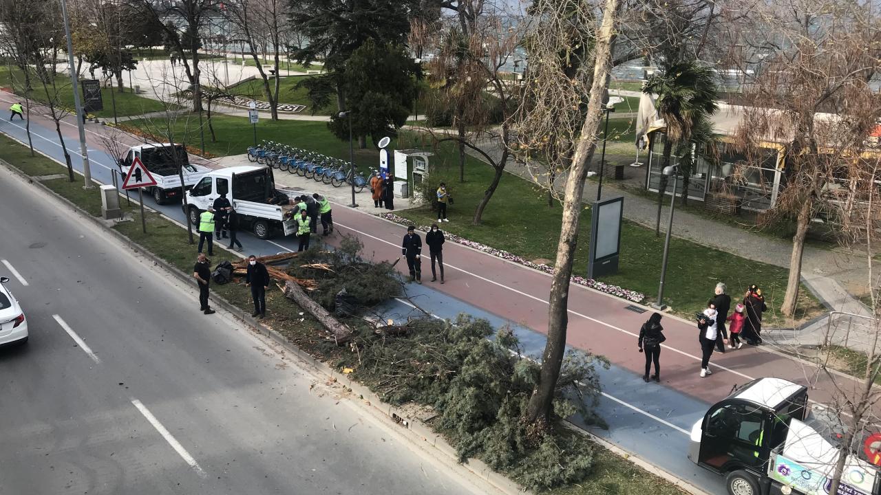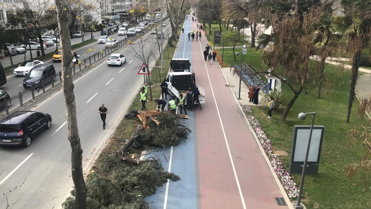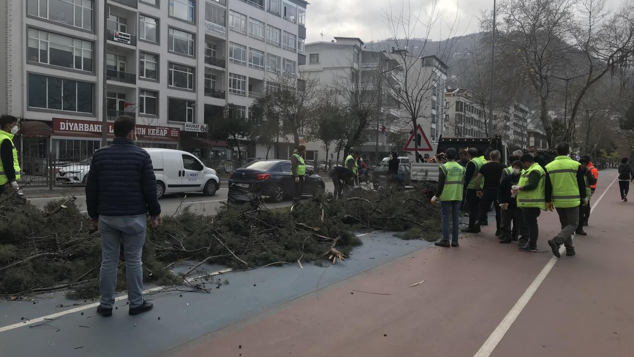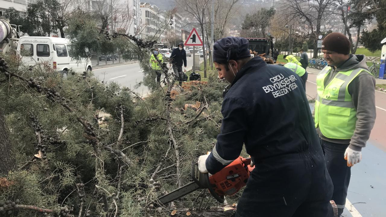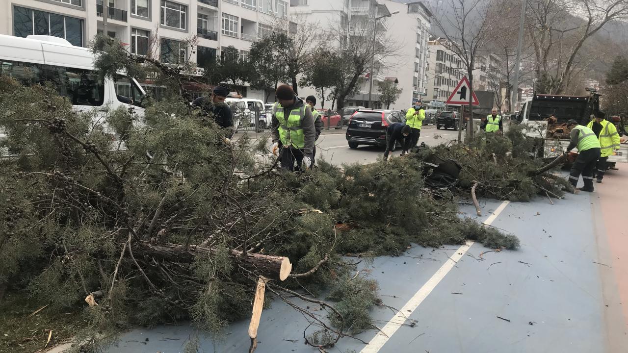 Belediye ekipleri tarafından devrilen ağaç, motor aracılığıyla kesilerek araçlara yüklendi.