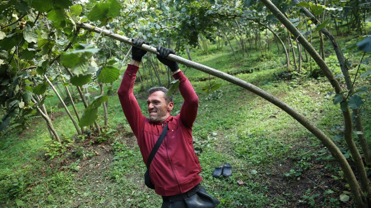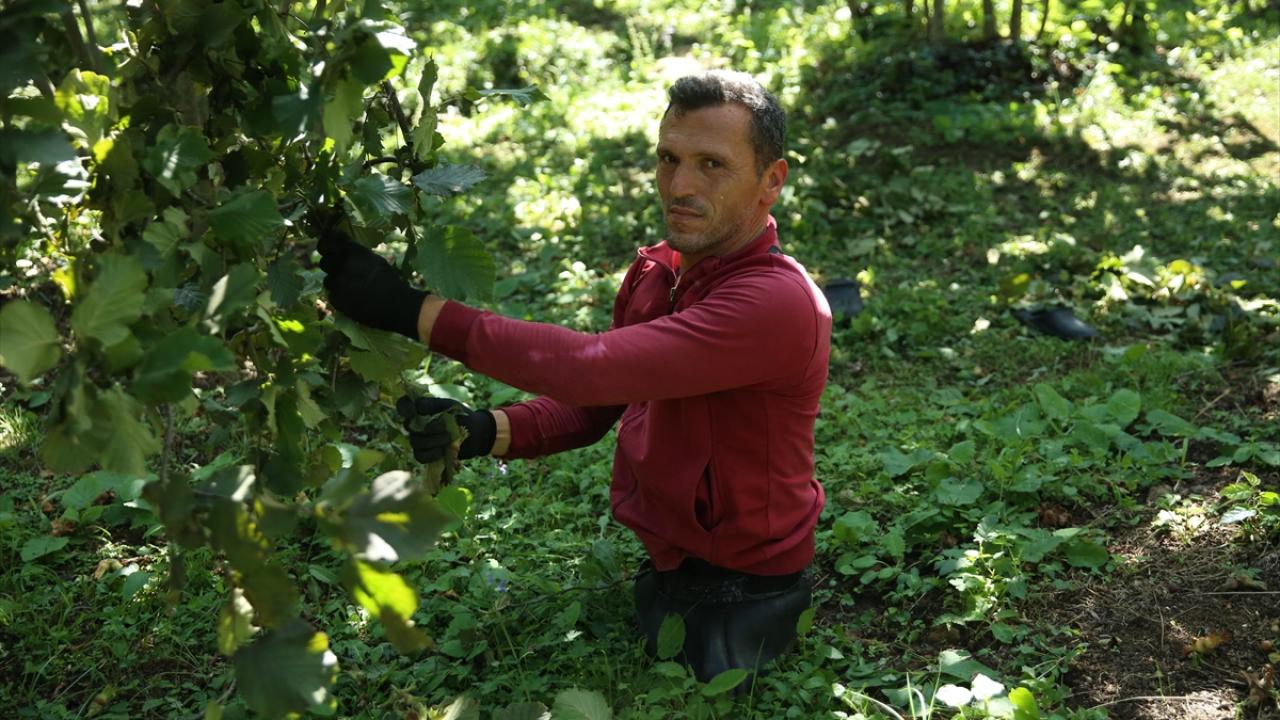 Her gün saat 08.00`de bahçeye giden Yalçın, engeline aldırmadan saat 17.00`ye kadar ağaçlardan fındık topluyor.