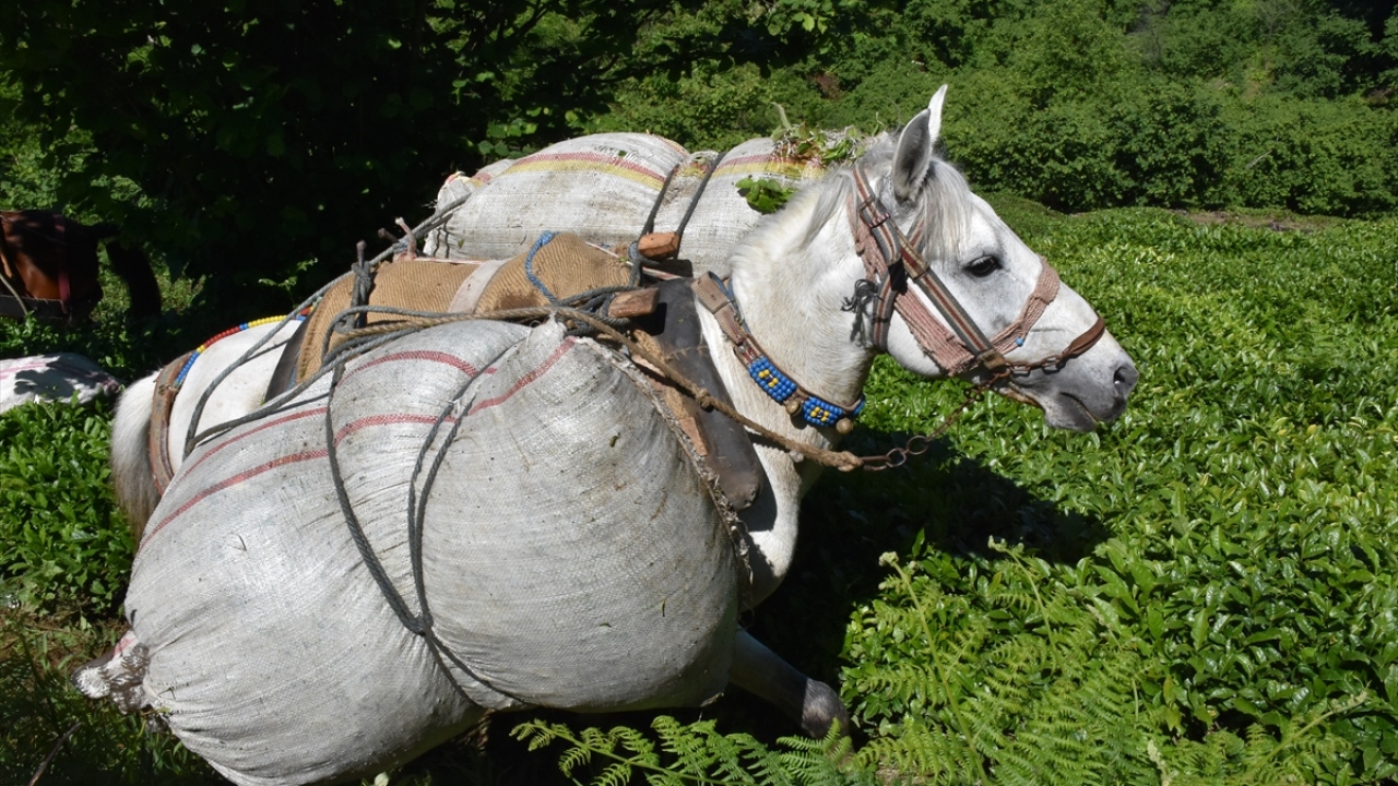Sıcak hava ve engebeli arazi nedeniyle zorluk çeken yöre insanı, topladıkları çayı, arazi şartları dolayısıyla at sırtında taşıyarak "harmana" getiriyor.