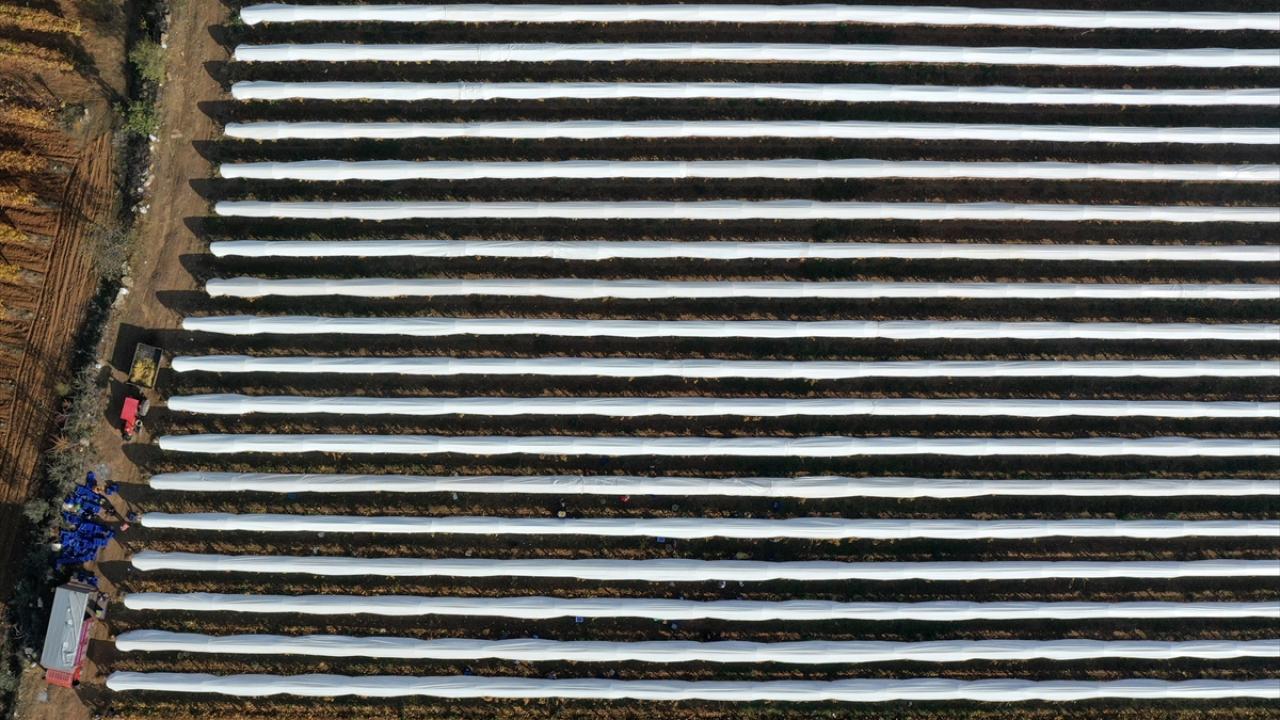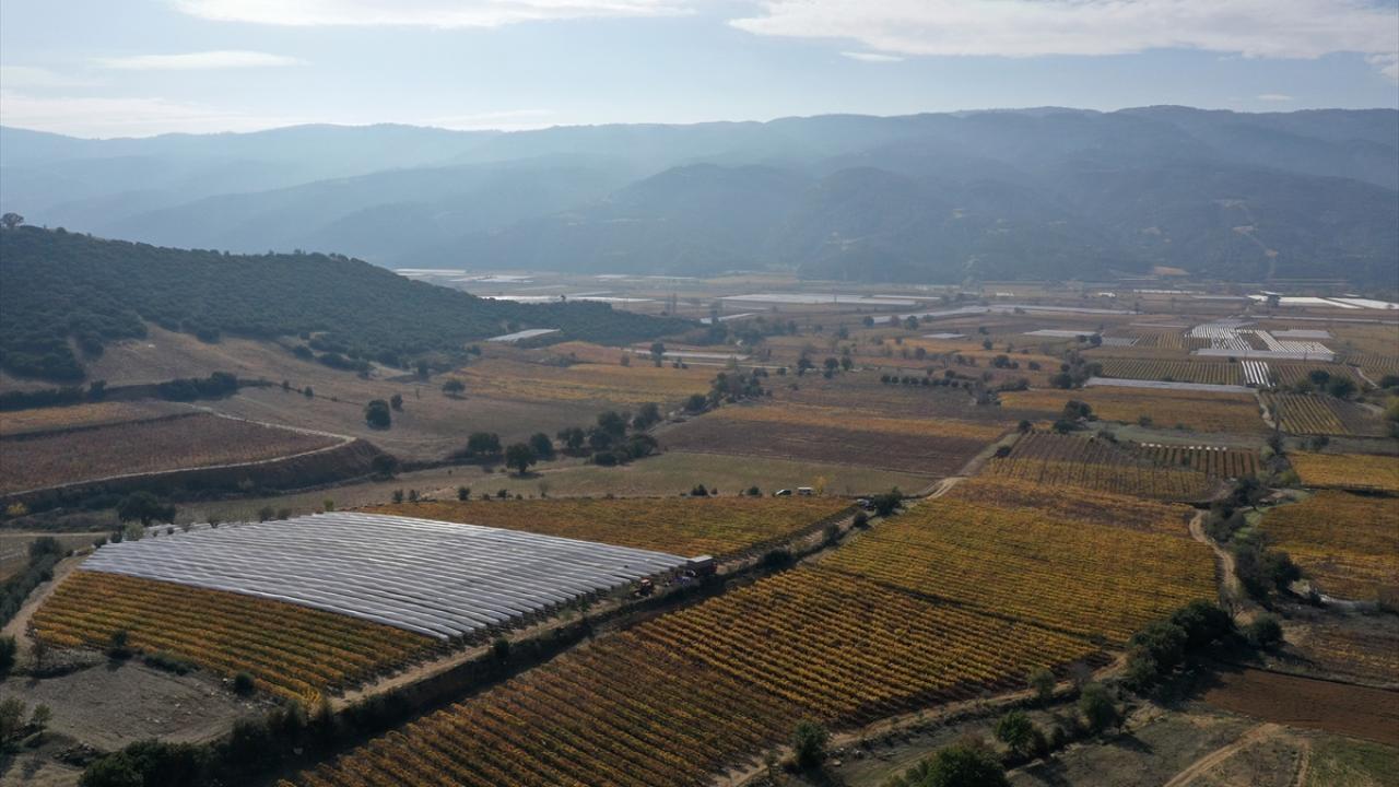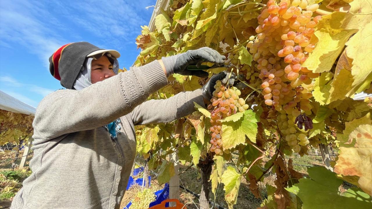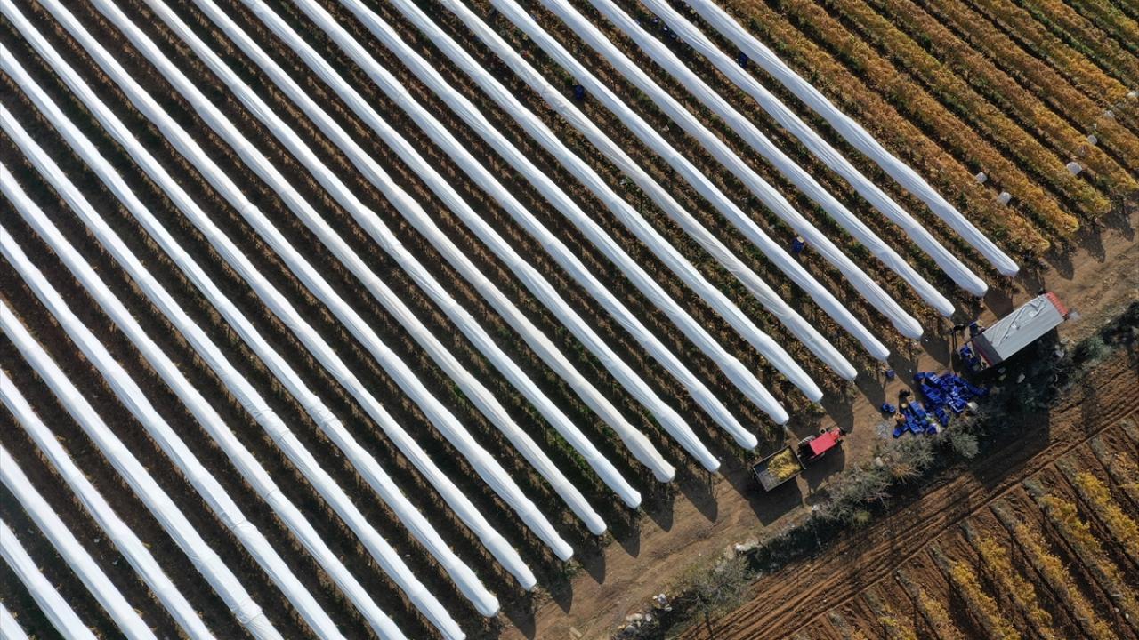 Hava koşulları nedeniyle sararan bağlardaki üzümleri toplamak için sabahın erken saatlerinde mesaiye başlayan işçiler, asmaların üzerindeki örtülerin altına girerek üzümleri topluyor.