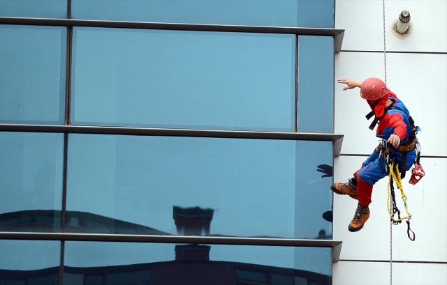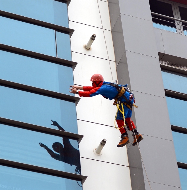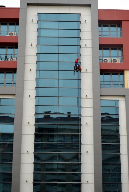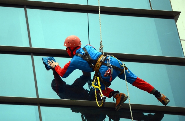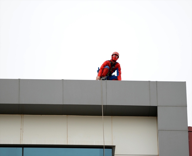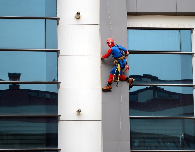 Zorlu meslekler arasında yer alan dış cephe cam temizliğini iş olarak seçen 47 yaşındaki Tamer Uysal, 4 yıldır "örümcek adam" kostümüyle yerden onlarca metre yükseklikte bir ipin ucuna bağlı çalışıyor. Eskişehir'de yüksek binaların cam temizliğini ve tabela montajını yapan Tamer Uysal, 30 yıl kadın kuaförlüğü yaptıktan sonra işletmesini eşine devrederek 4 yıl önce bu mesleği seçti. İki çocuk babası Uysal, dağcılık tutkusunu yaptığı işe uyarlayarak, ekmeğini yükseklerde kazanıyor.