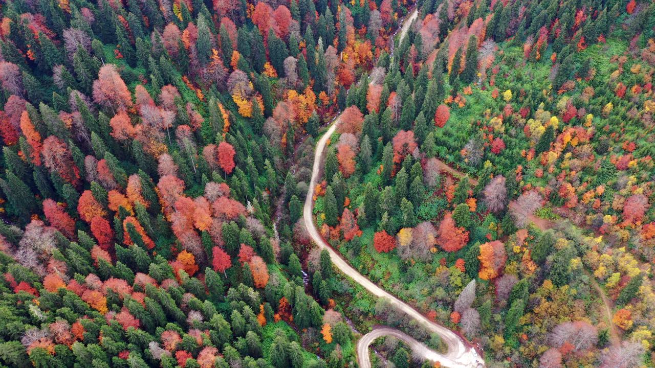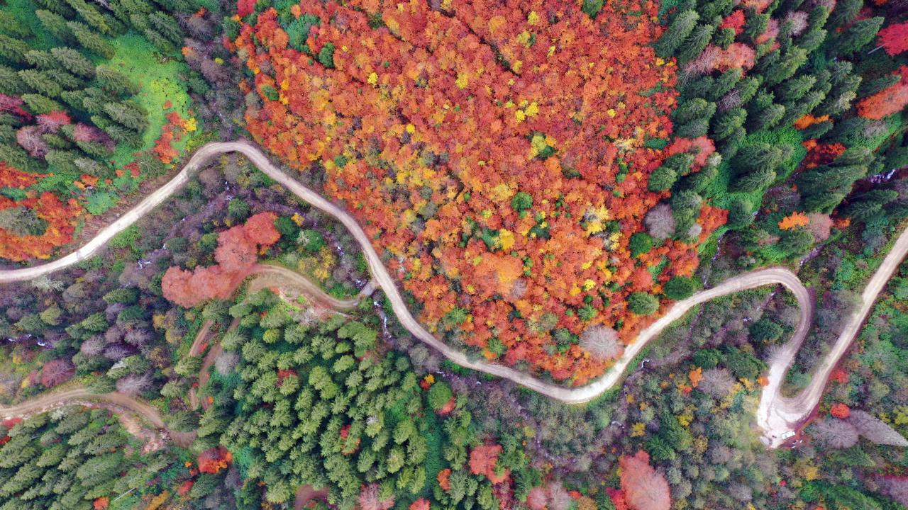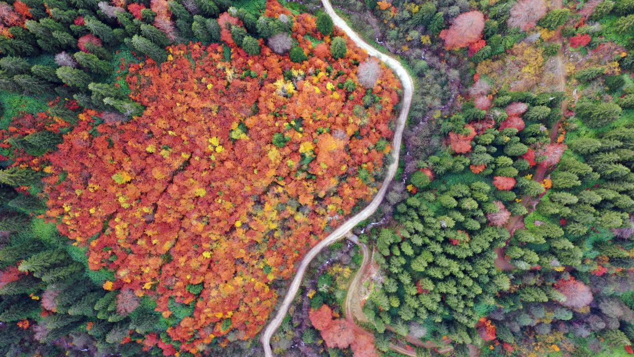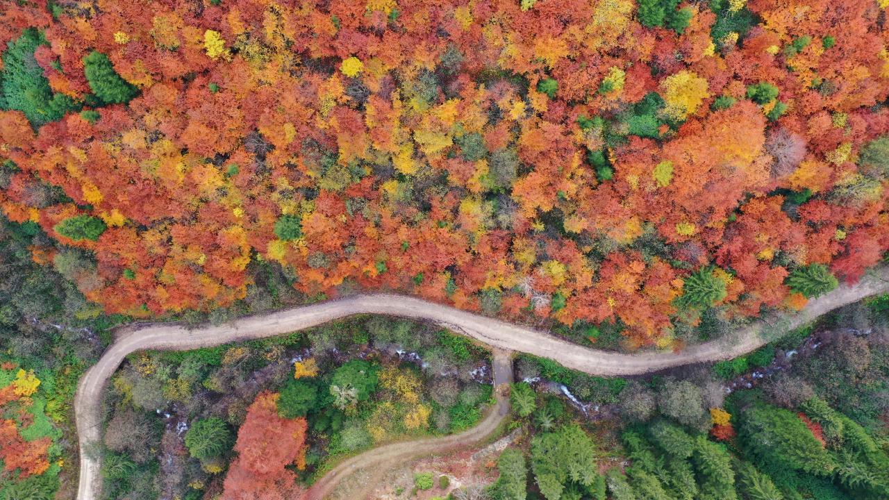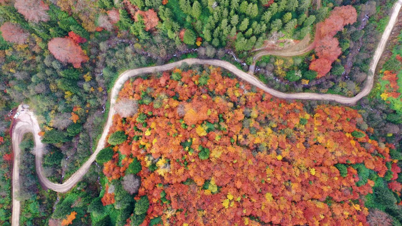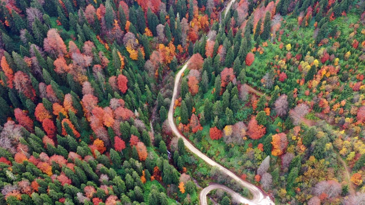 Sonbaharın sarı ve kızıl renkleri ile doyumsuz manzaralar oluşturan Örümcek Ormanları, dron ile yapılan hava çekimlerinde de renk cümbüşünü ortaya koyuyor.