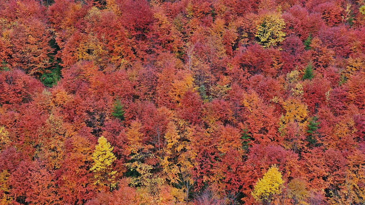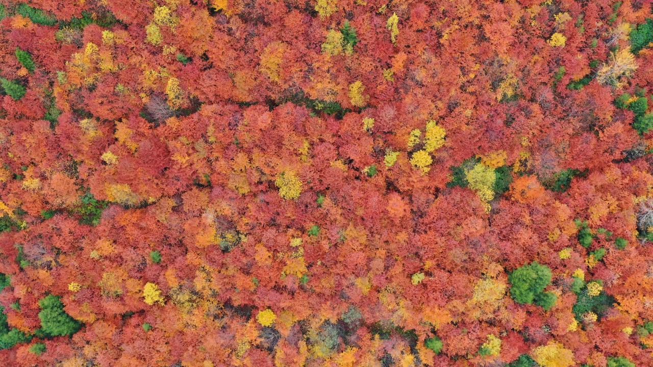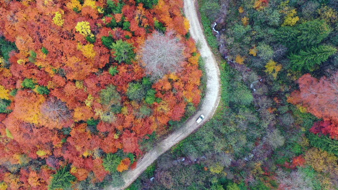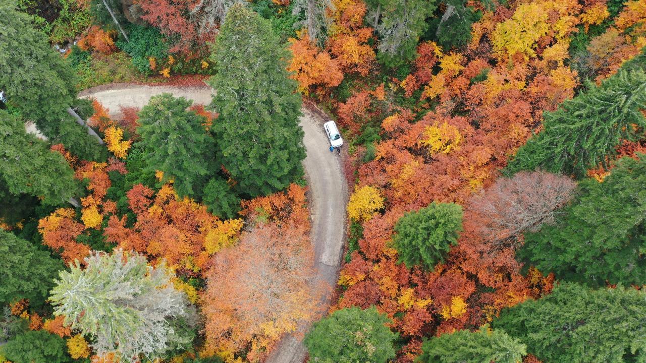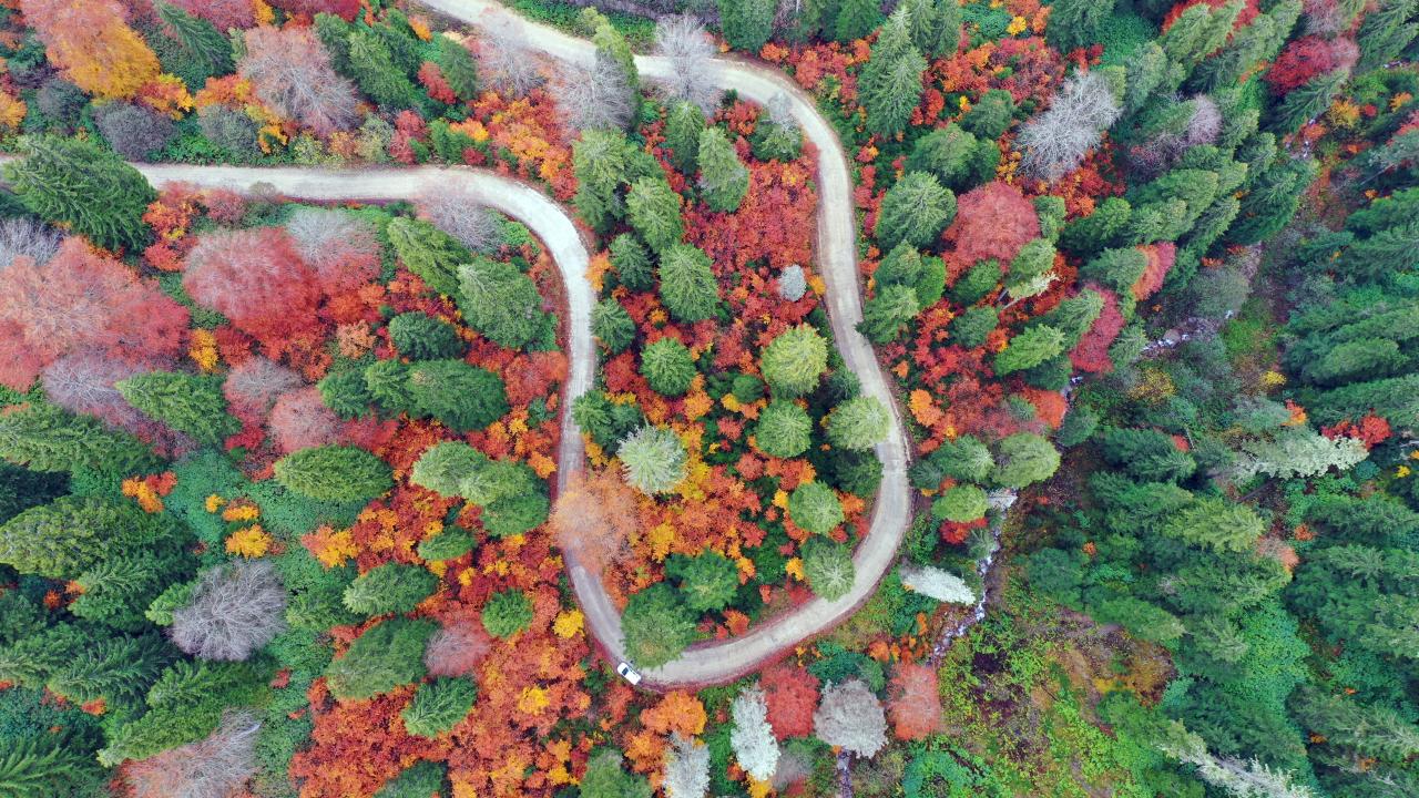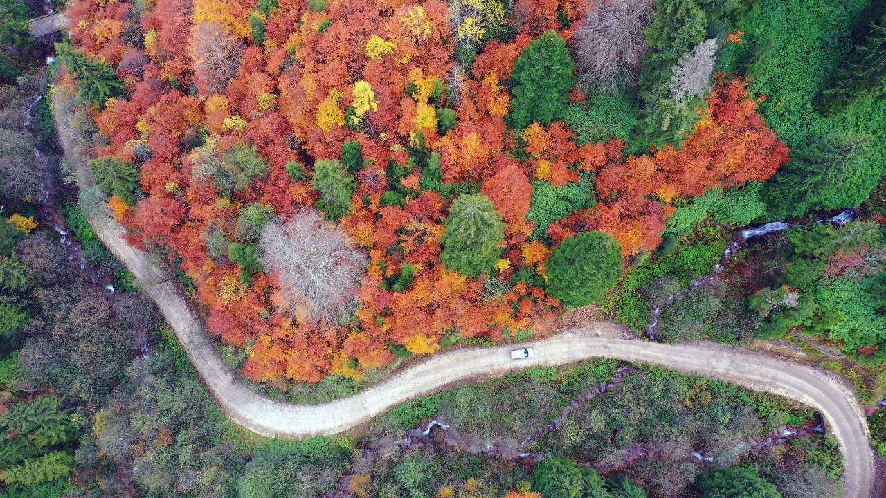 Sonbaharın sarı ve kızıl renkleri ile doyumsuz manzaralar oluşturan Örümcek Ormanları, dron ile yapılan hava çekimlerinde de renk cümbüşünü ortaya koyuyor.