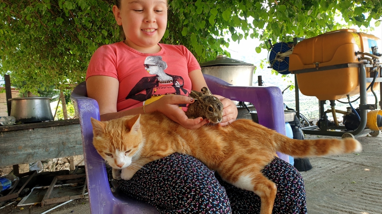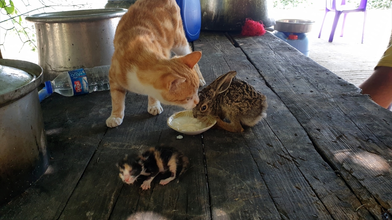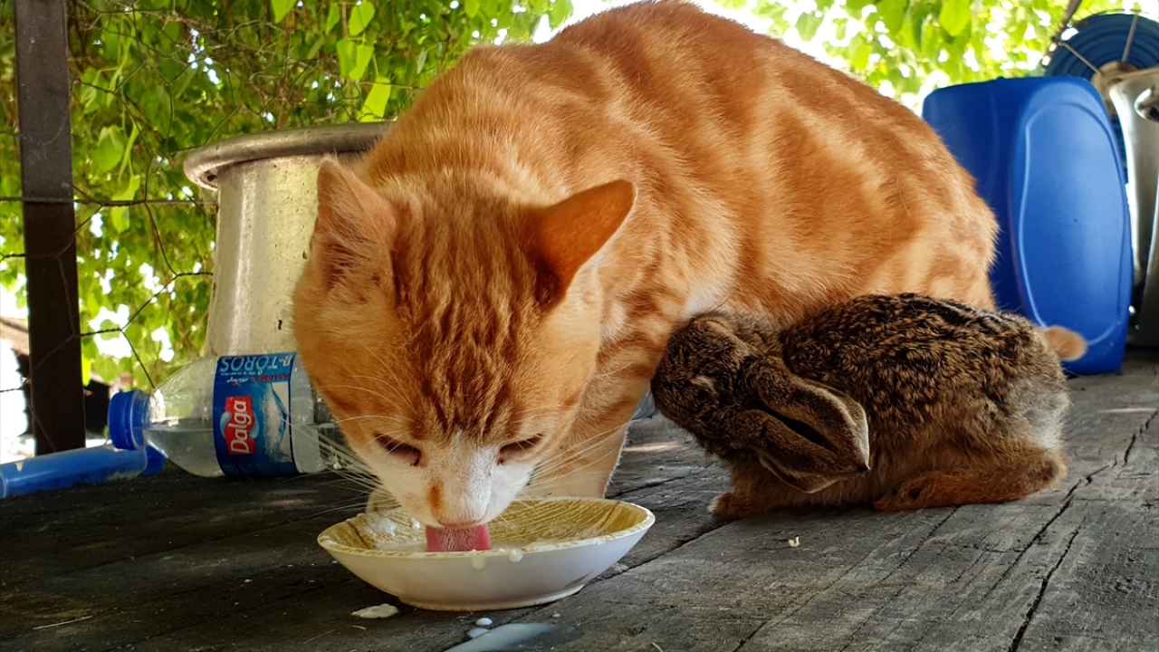 Osmaniye'nin Sumbas ilçesinde tarlada bulunup eve getirilen tavşan yavrusuna, ailenin kedisi Sarıkız annelik yapıyor.