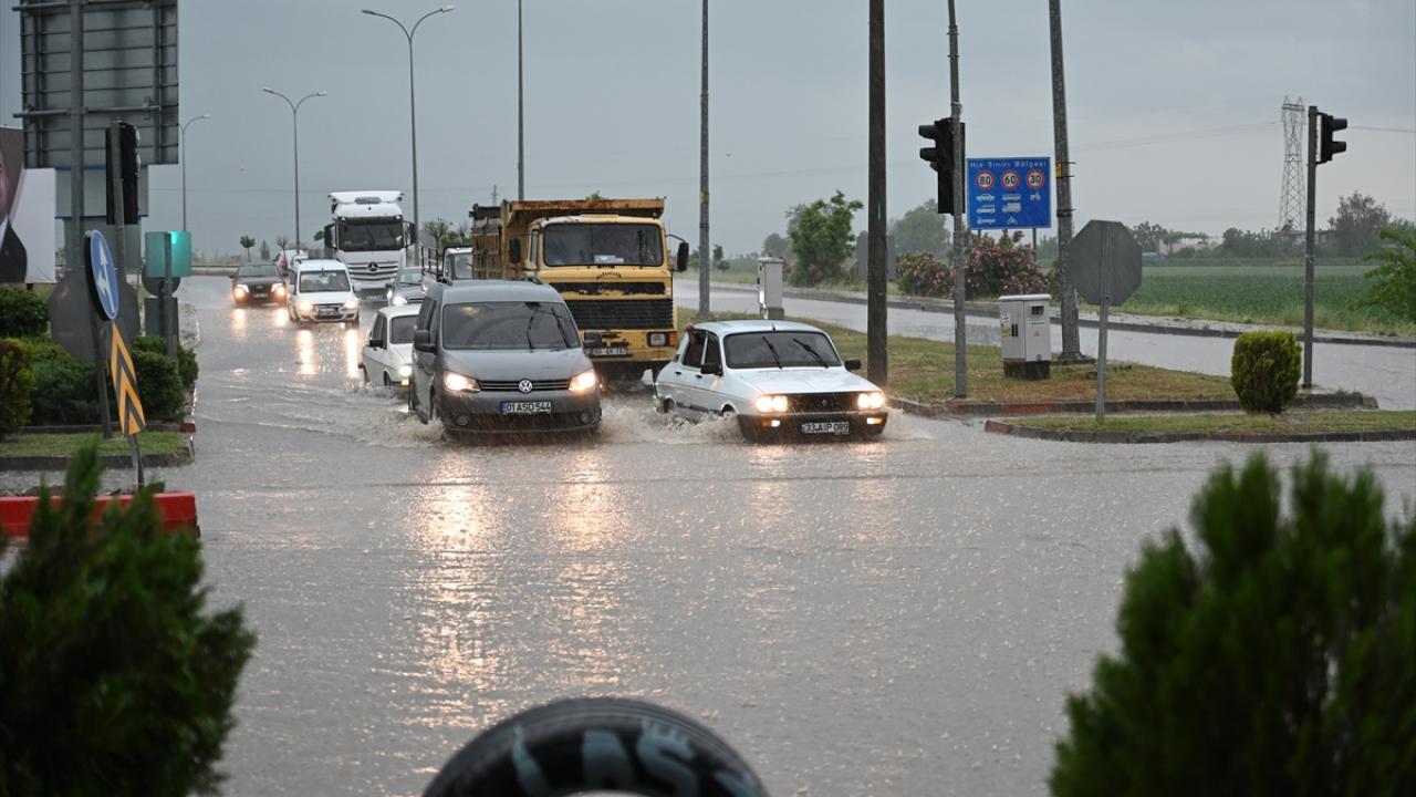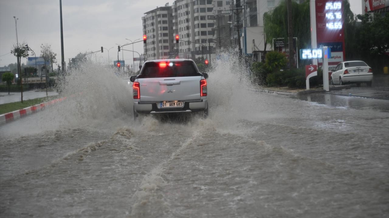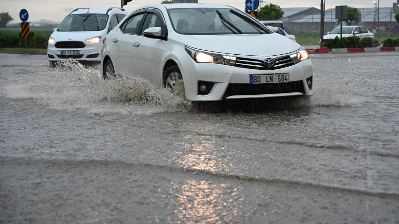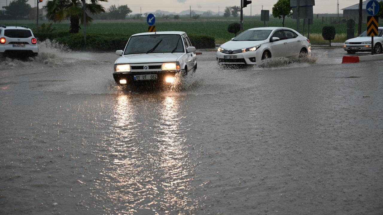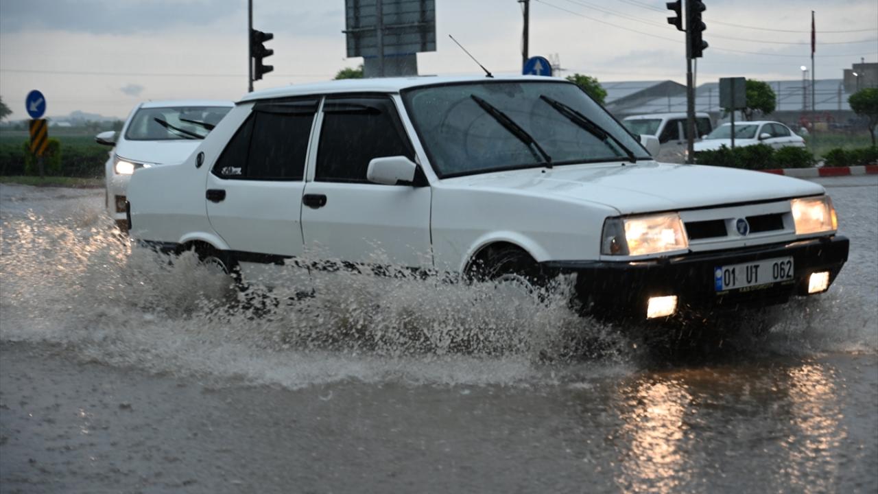 Kadirli ilçesinde su birikintilerinin oluştuğu cadde ve sokaklardaki araçlar mahsur kaldı.