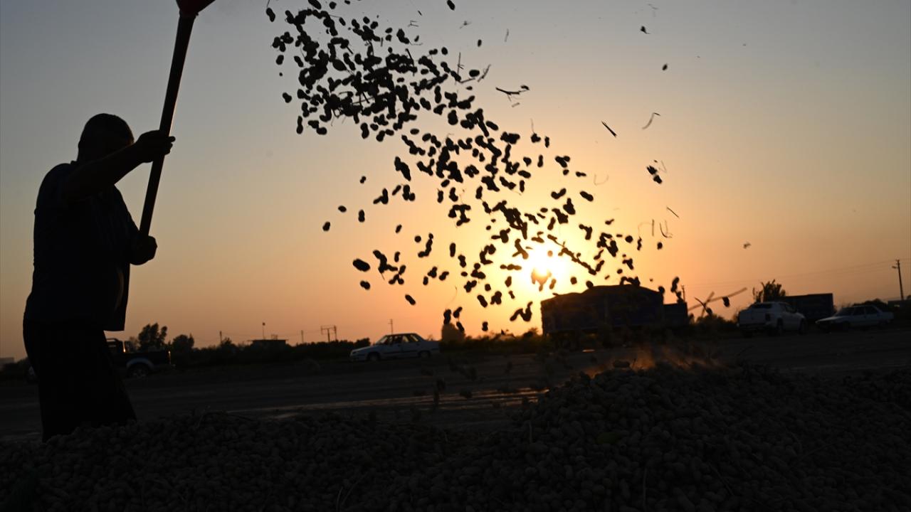 Traktörlerle toplanıp römorklara doldurulan ürünler, kuruması için güneş gören alanlara serildi.