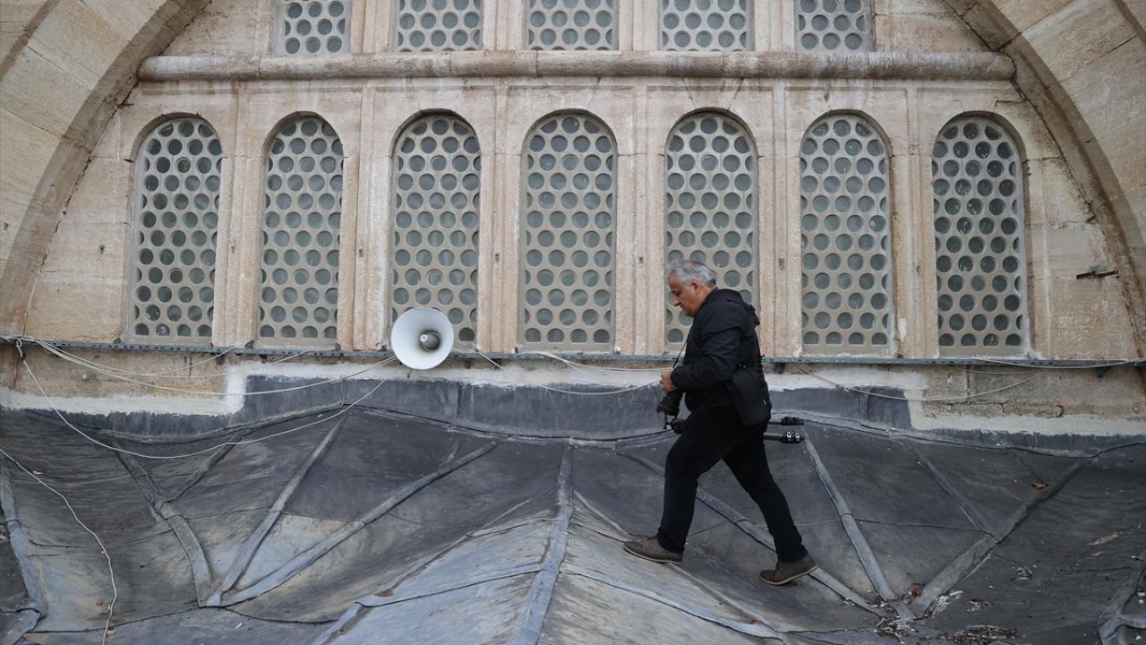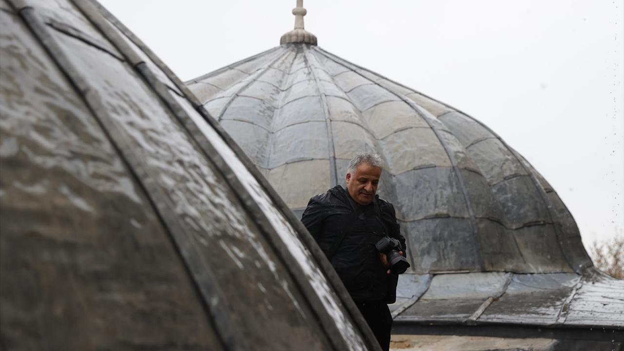 Kurşun kaplamaların üzerinde yürümek için uygun tabanlı ayakkabı tercih eden Şahin, merdiven yardımıyla çıktığı kubbeleri fotoğraflıyor.