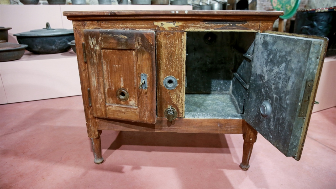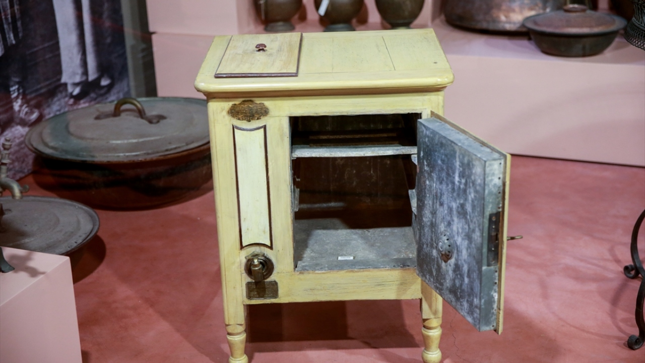 Osmanlı saray mutfağında kullanılan 19. yüzyıla ait soğutucu dolaplar, dondurma makinesi, cam ve metalden karlıklar ile toprak küpler Saray Koleksiyonları Müzesinde sergileniyor.