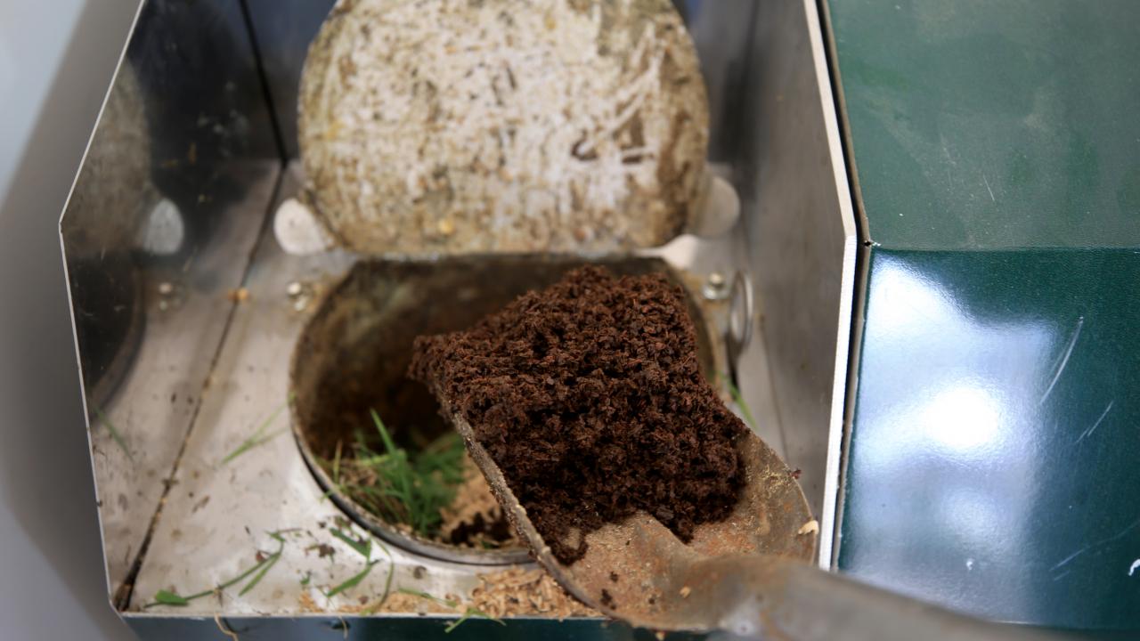 Organik atıkları bir miktar talaş, ot ve samanla harmanlayan öğrenciler, makine yardımı ile fermente ediyor.