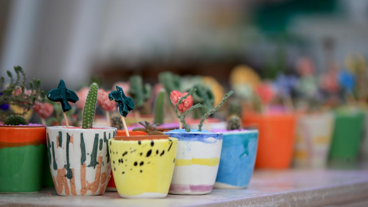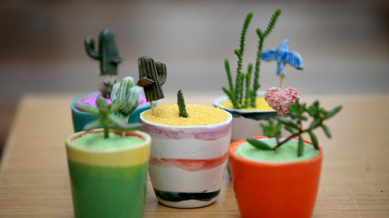 Önceden hazırlanmış kalıplarda killi toprak ile saksı üreten öğrenciler, fermente süreci tamamlanan kompostları saksılara doldurup sukulent yetiştiriyor.