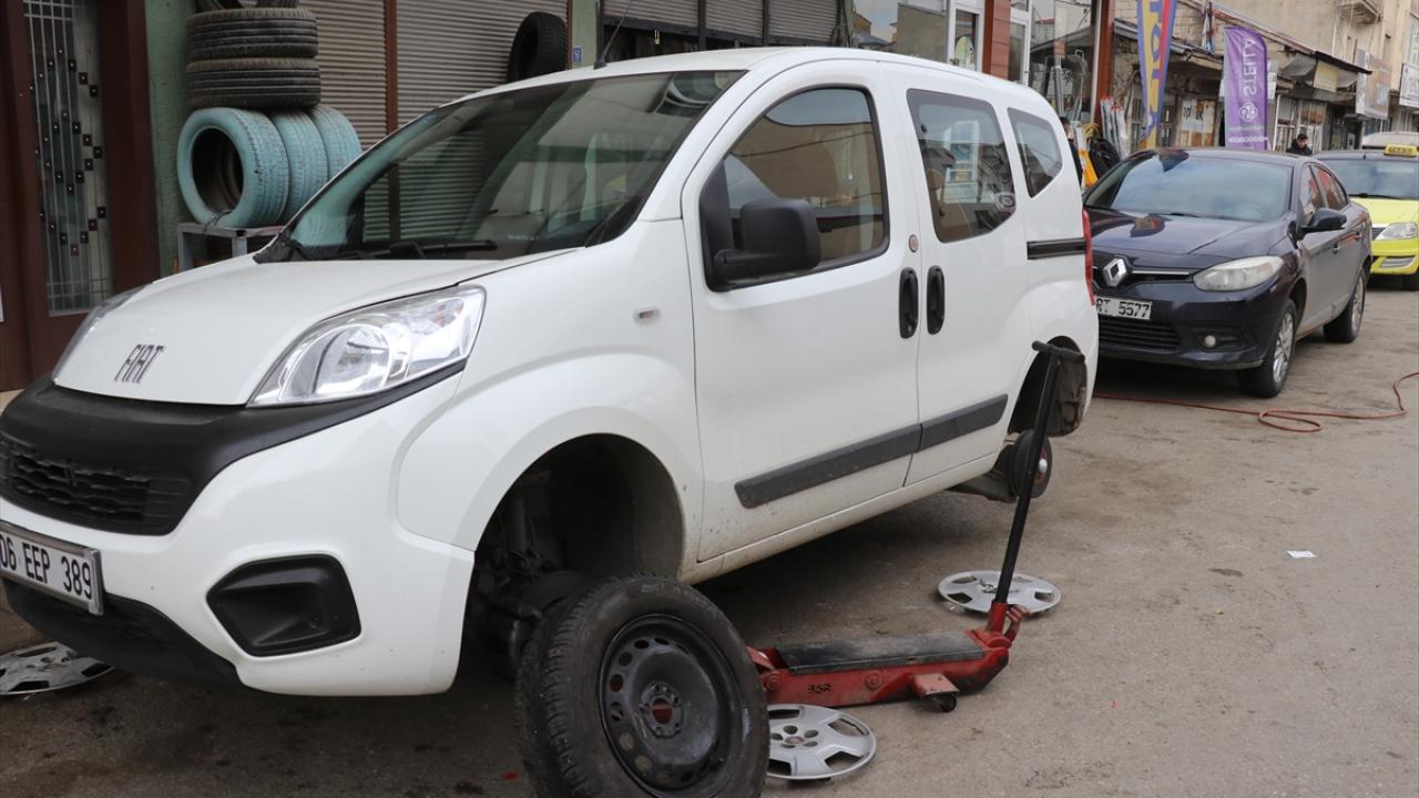 Yaşanan yoğunluk nedeniyle araçların lastik değişim işlemleri sırasıyla gerçekleştiriyor.
