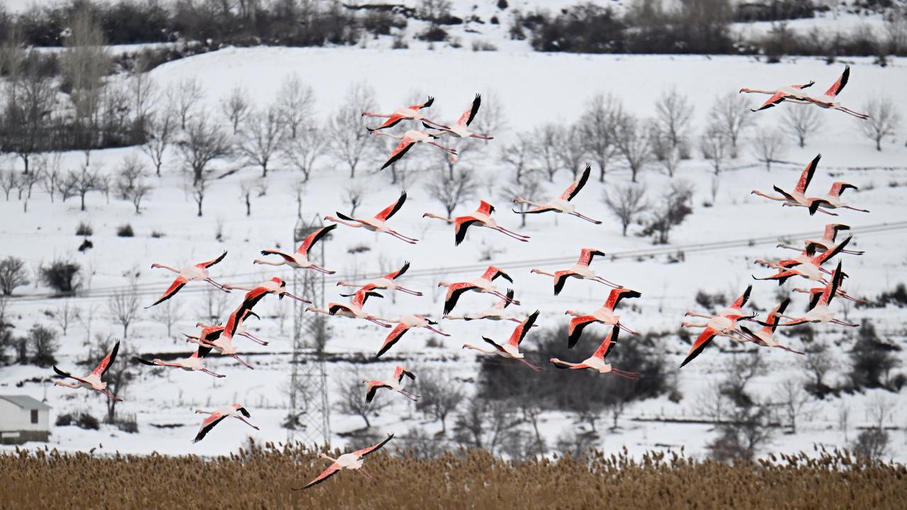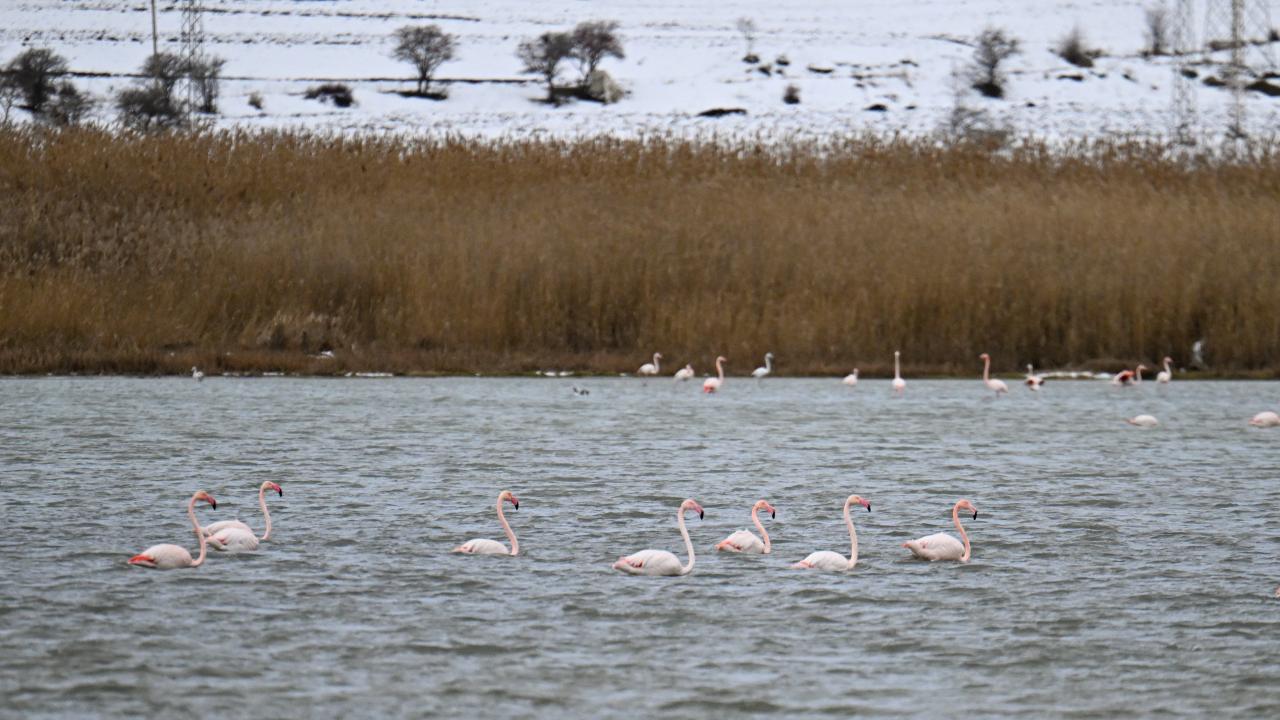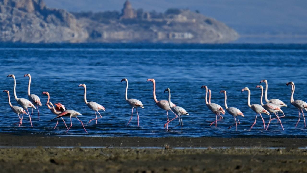 Ötücü kuğular ile göç dönemi geçen flamingolar kışı Van Gölü havzasında geçiriyor