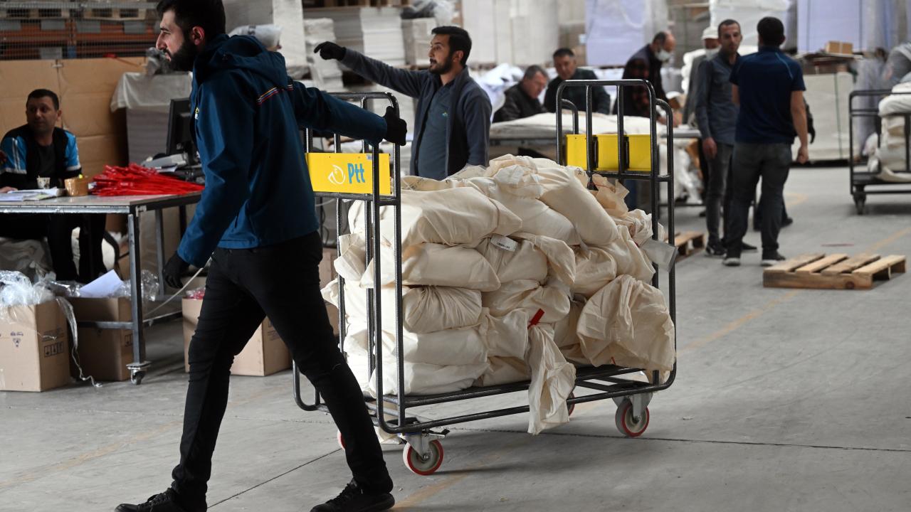 Çuvallama işleminin ardından matbaada hazır bulunan PTT görevlileri, paketlenmiş pusulaları ilçelere göre araçlara yükleyerek yola çıktı.
