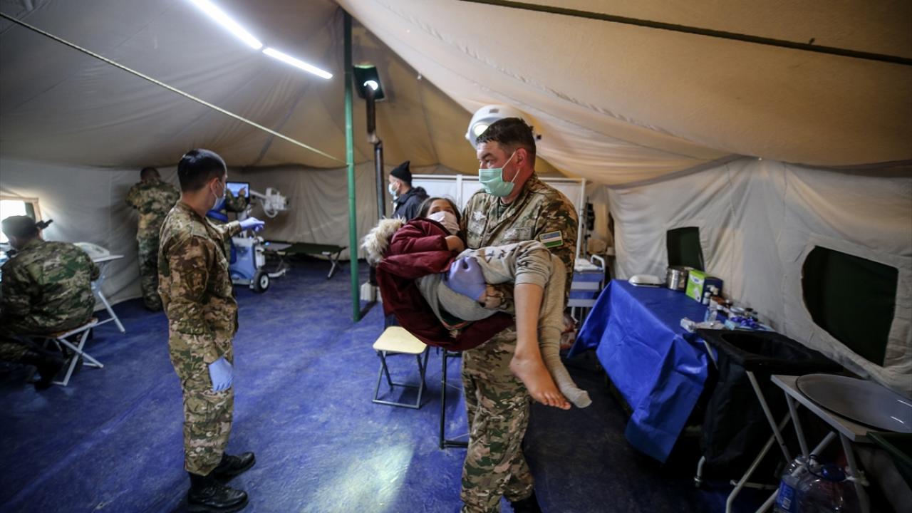 Kahramanmaraş merkezli depremlerin etkilediği illerden Hatay'da Özbekistan'dan gelen 200 asker, hem arama kurtarma çalışmalarına destek veriyor hem de oluşturdukları sahra hastanesiyle afetzedeleri tedavi ediyor.
