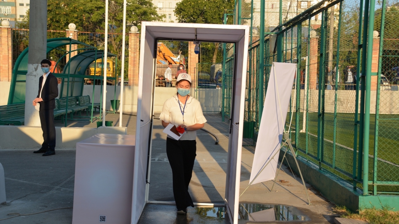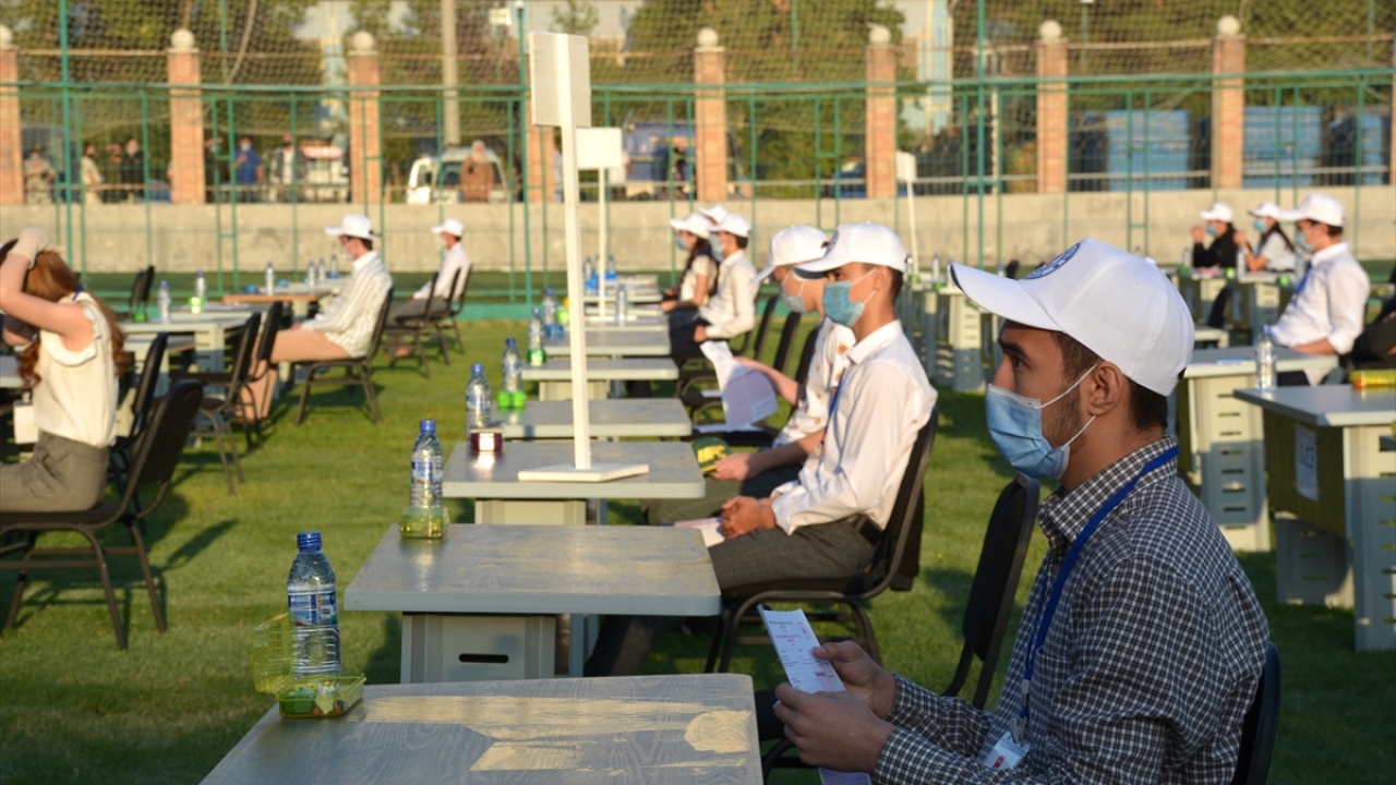 TOBB ETÜ Taşkent Şubesini bünyesine alan Taşkent Devlet Ekonomi Üniversitesi stadında yeni tip koronavirüs nedeniyle sosyal mesafe ve sıhhi kurallara riayet edilerek düzenlenen sınava giren öğrenciler, kapıda ateşleri ölçülerek içeriye alındı.