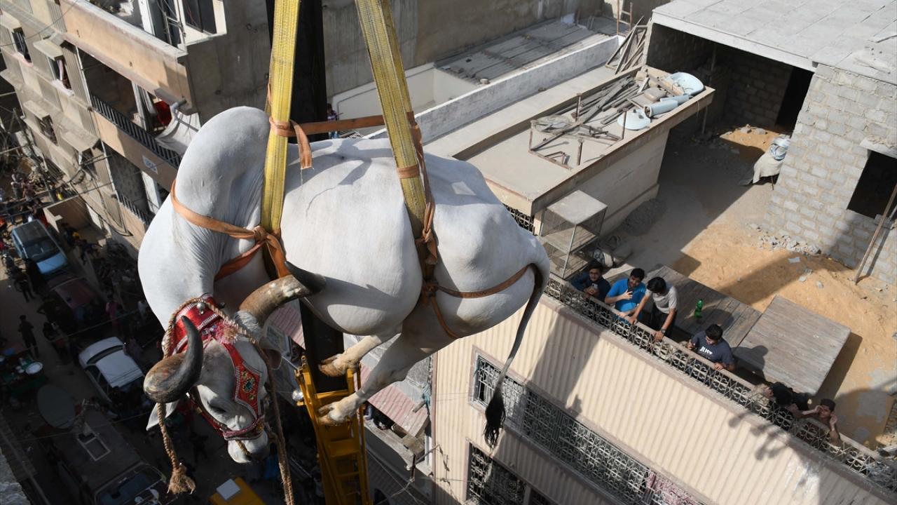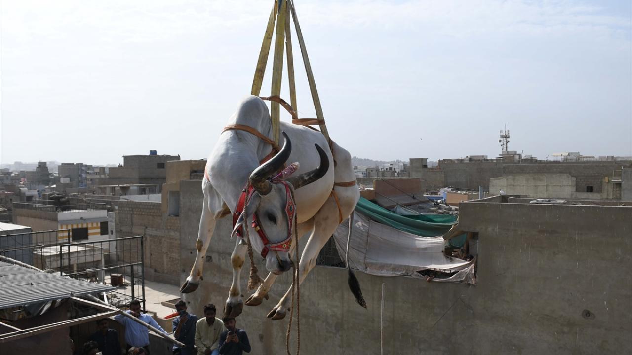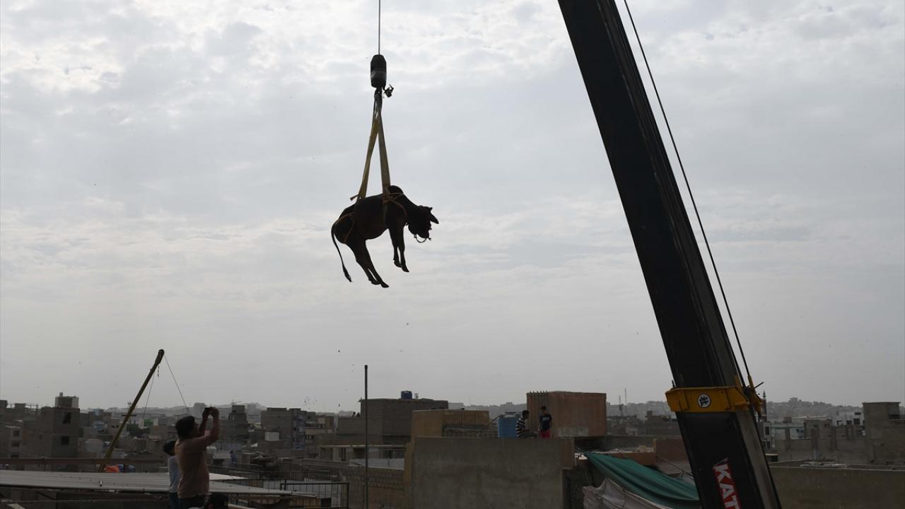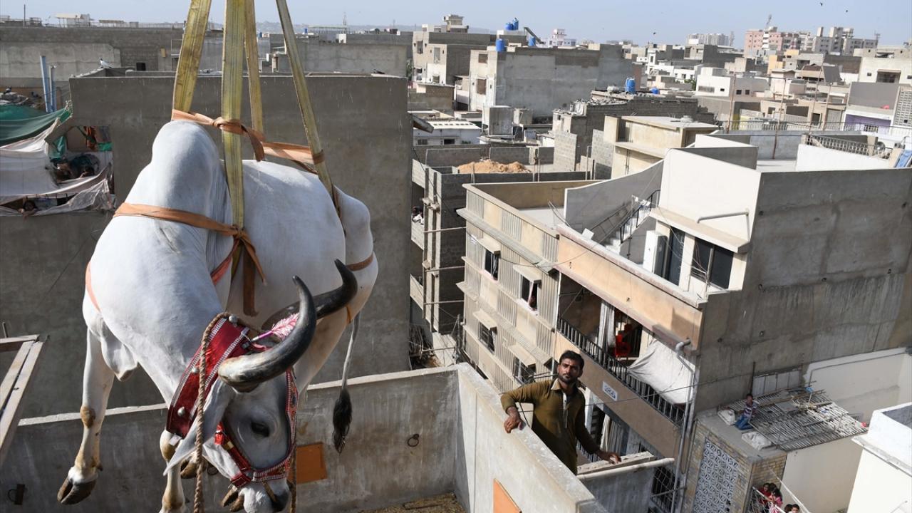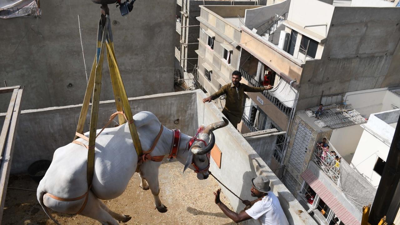 Pakistan'ın Karaçi kentinde bazı besiciler, Kurban Bayramı öncesi evlerin çatısında besledikleri kurbanlıklarını vinç yardımı ile indirerek kurban pazarına götürüyor.