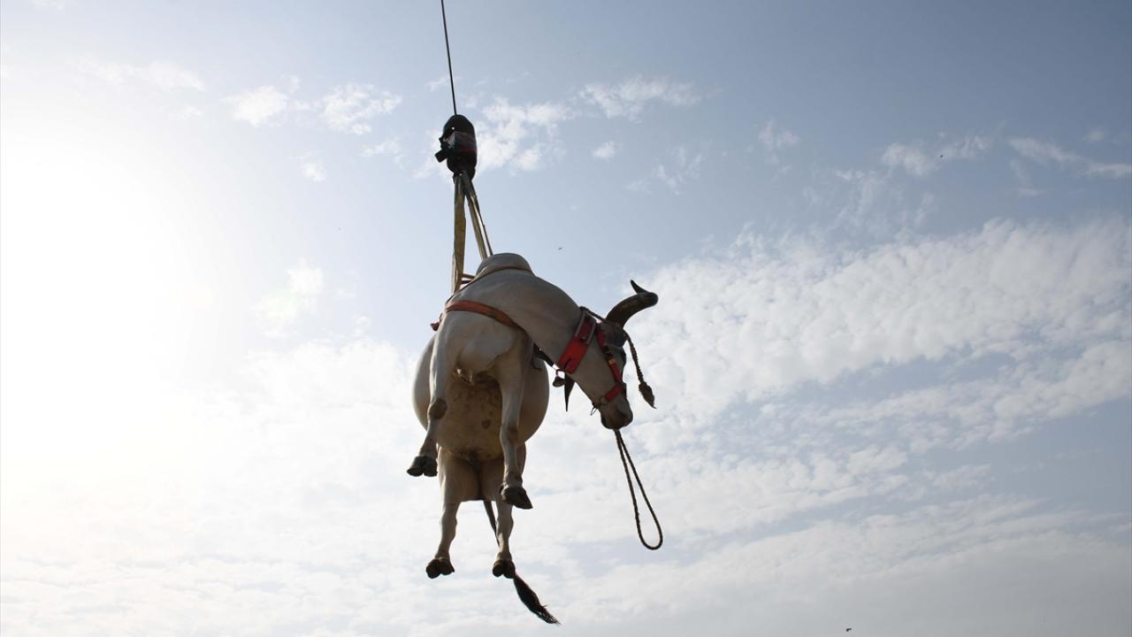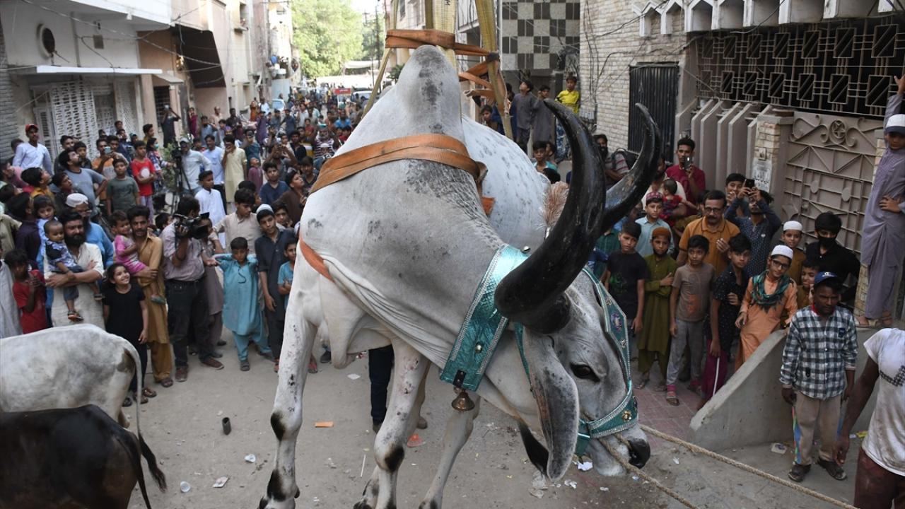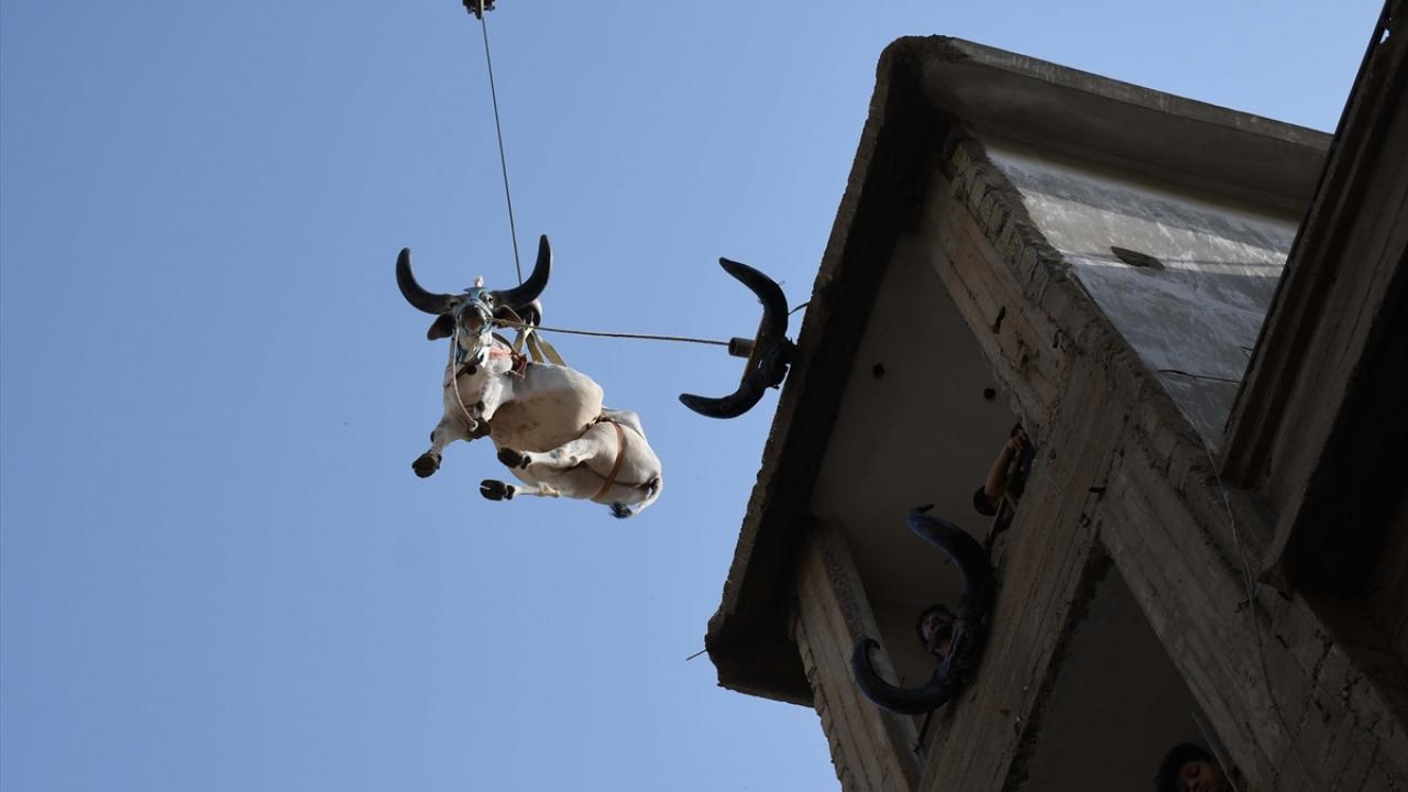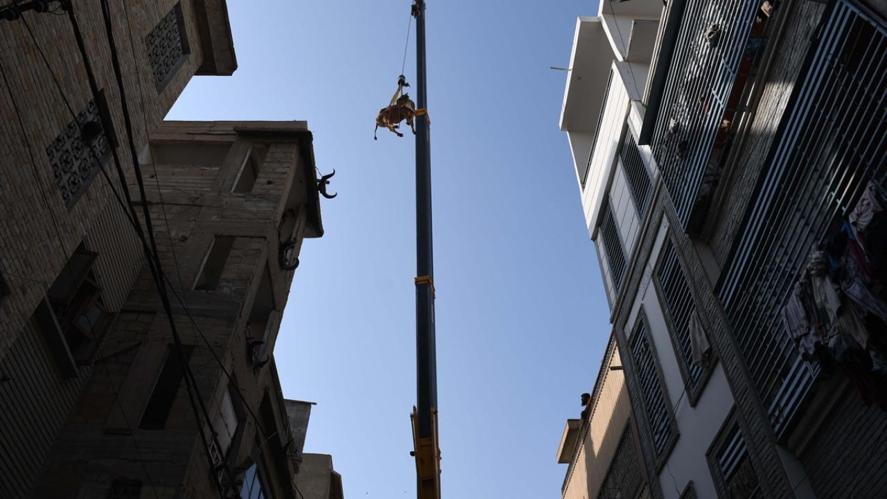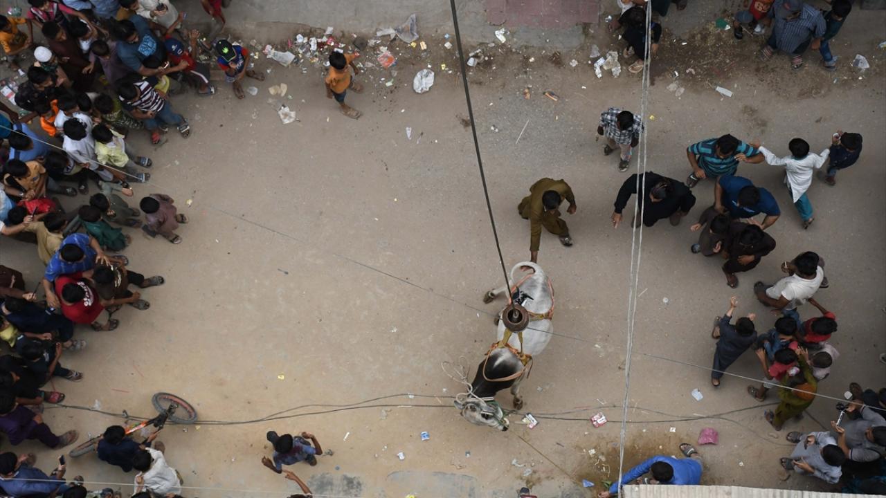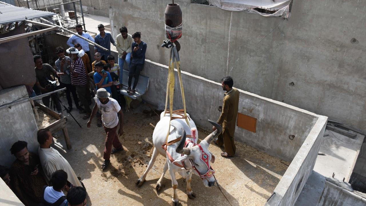 Pakistan'ın Karaçi kentinde bazı besiciler, Kurban Bayramı öncesi evlerin çatısında besledikleri kurbanlıklarını vinç yardımı ile indirerek kurban pazarına götürüyor.