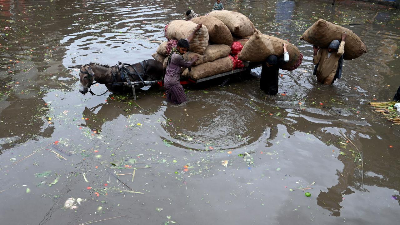 Dera İsmail Han’da çarşı ve pazarlar sular altında kalırken, trafikte tıkanıklıklar oluştu.
