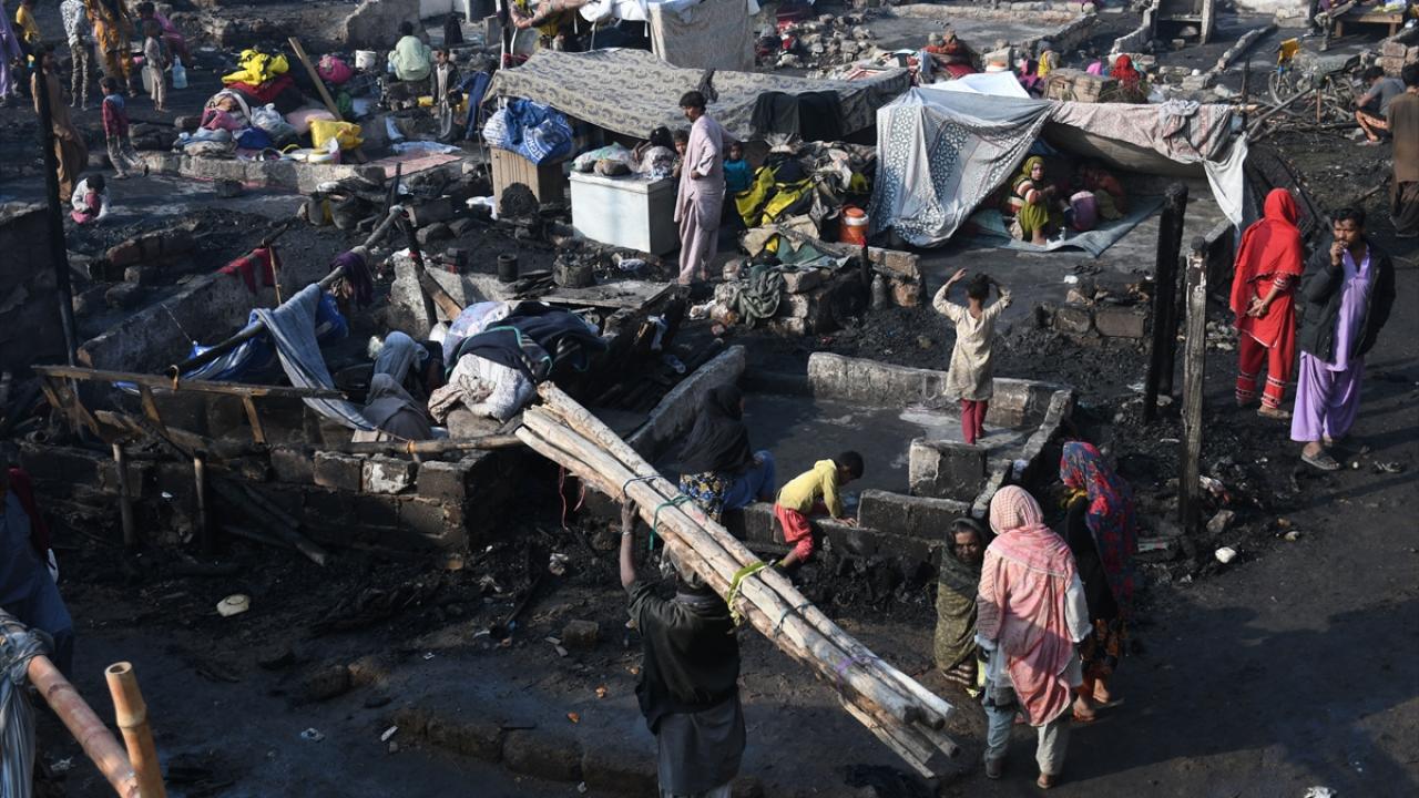 Pakistan'ın Karaçi kentinin Teen Hatti bölgesinde yer alan gecekondu mahallesinde çıkan yangın sonucu çok sayıda ev hasar gördü.