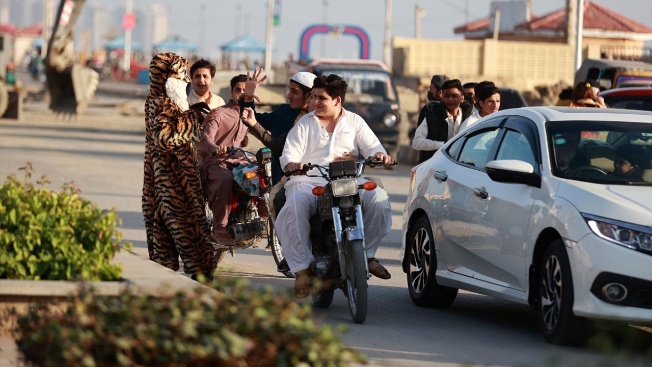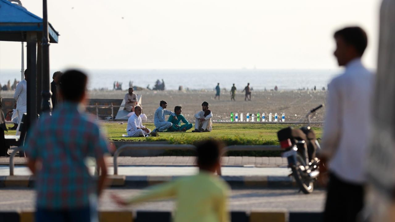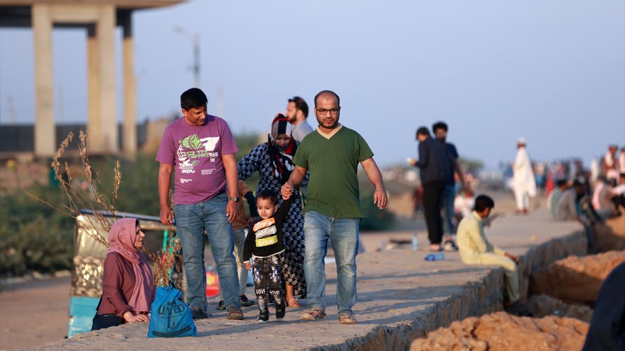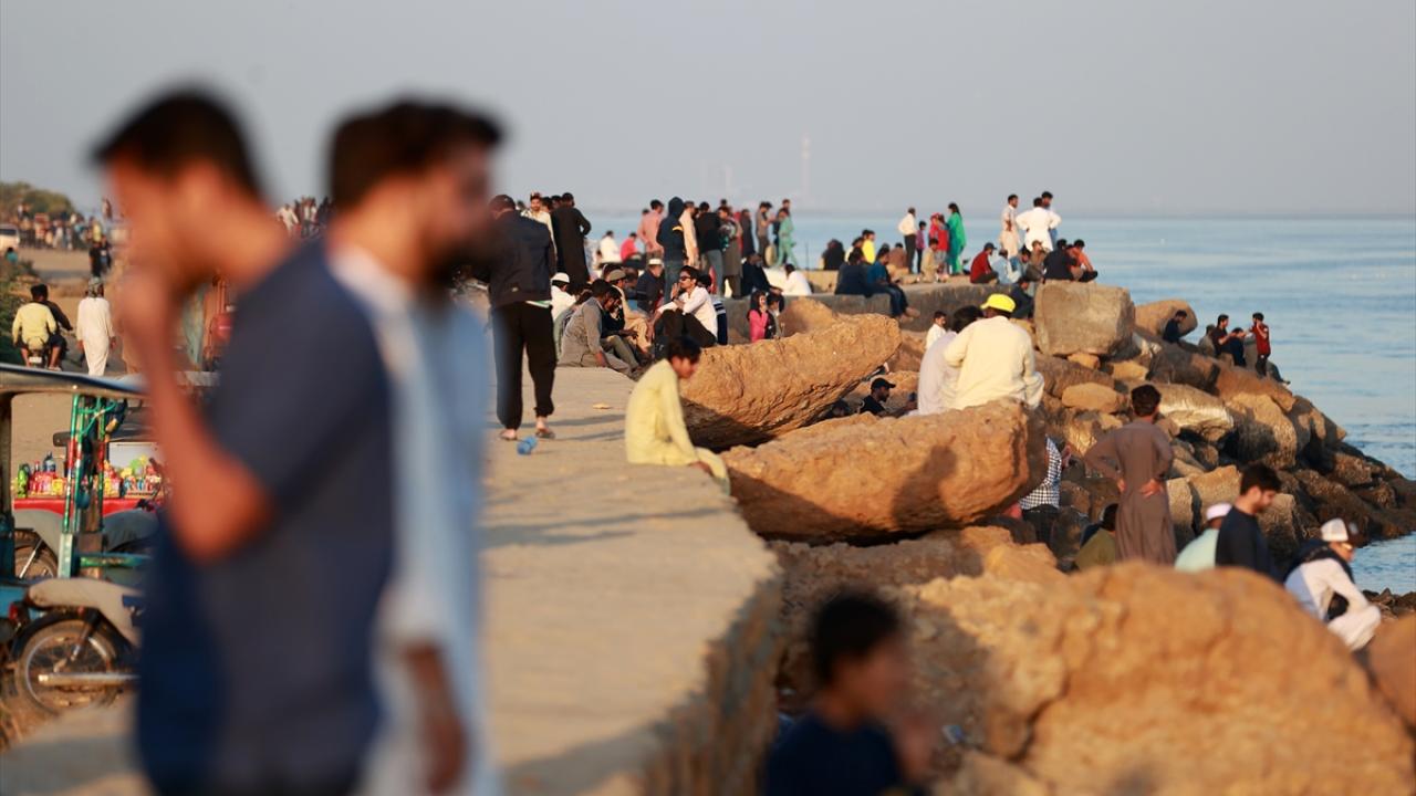 Pakistanlılar okyanus kenarında zaman geçiriyor.
