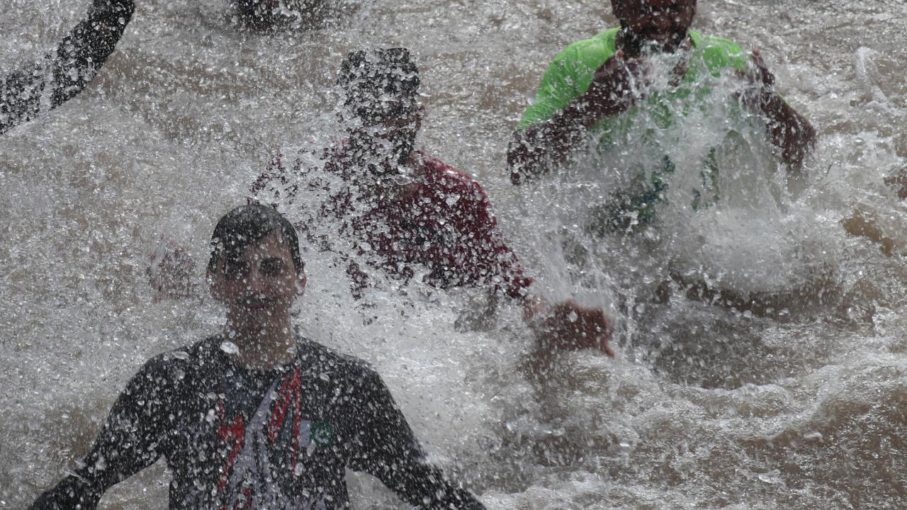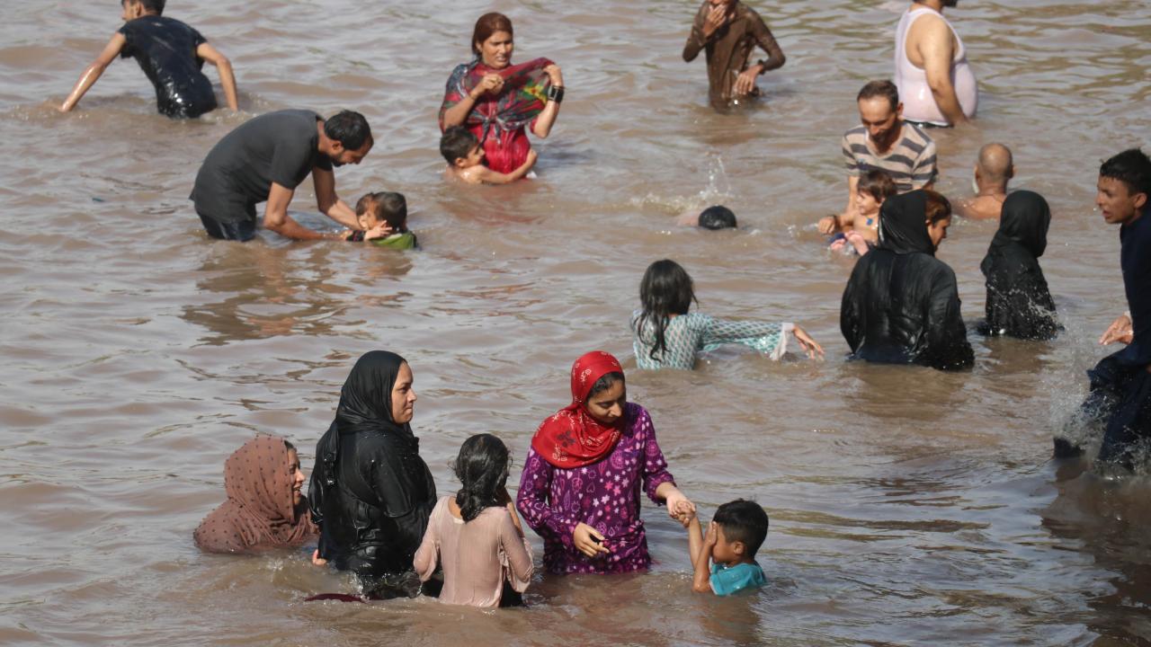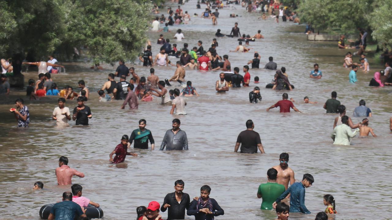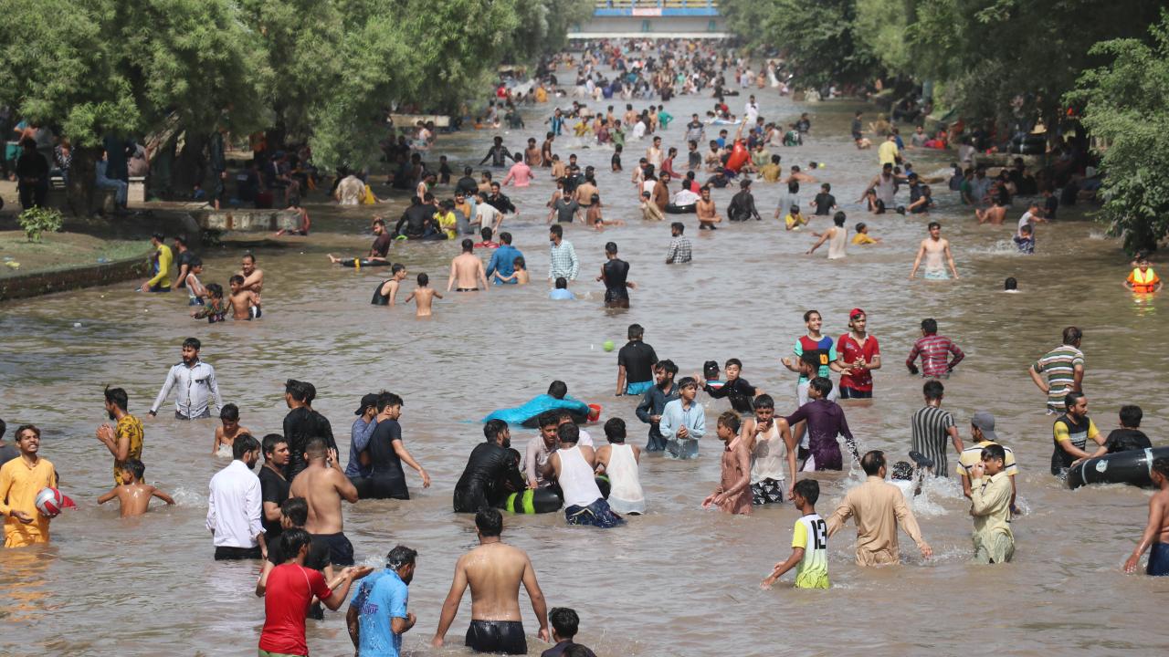 Pakistan'ın Karaçi kentinde vatandaşlar, son günlerde etkili olan sıcak hava nedeniyle kanalda yüzerek serinlemeye çalıştı.