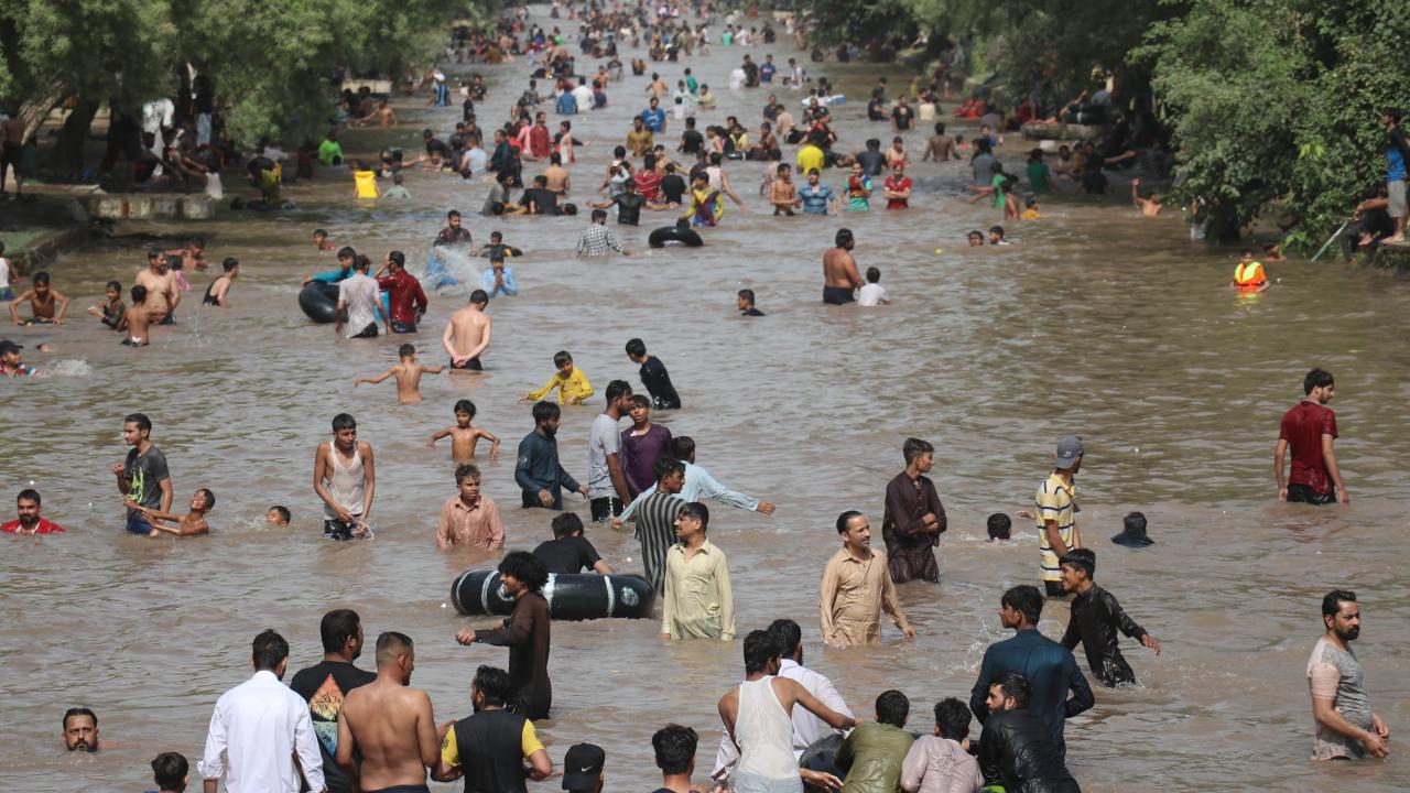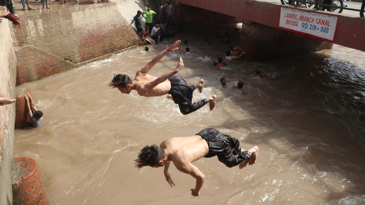 Pakistanlılar kanalda yüzerek serinlemeye çalışıyor