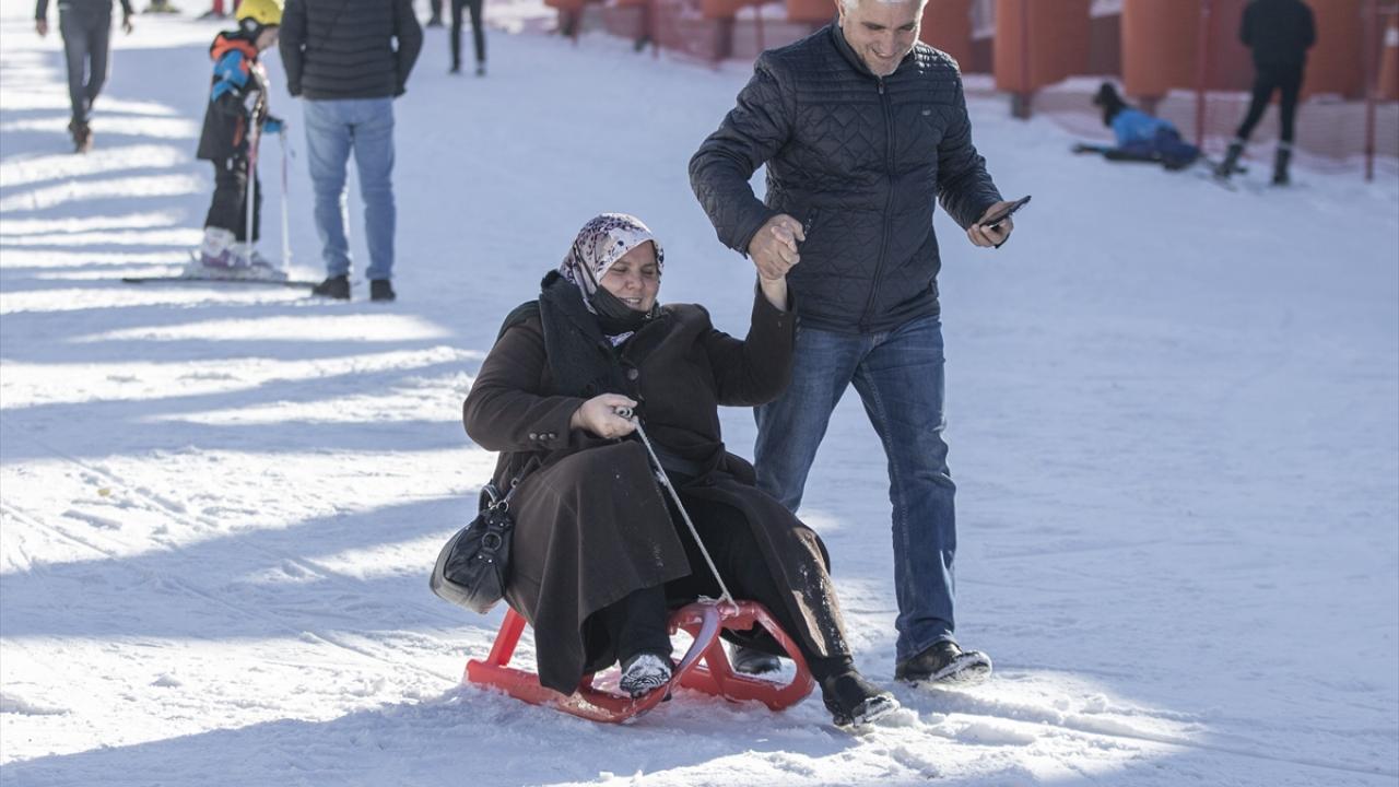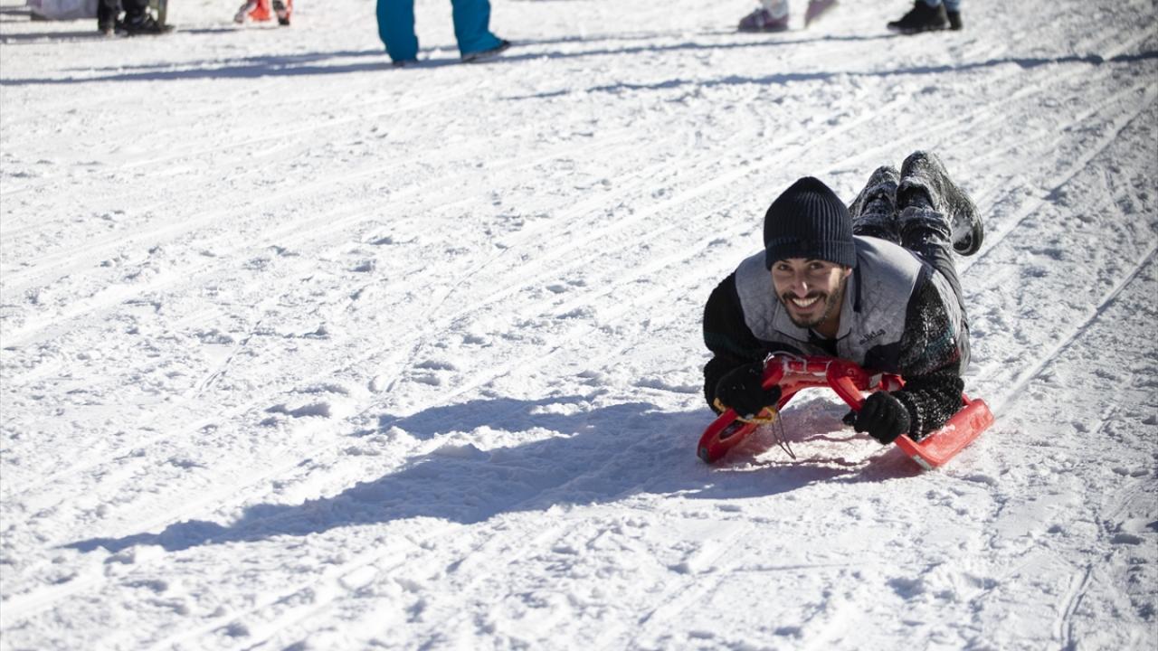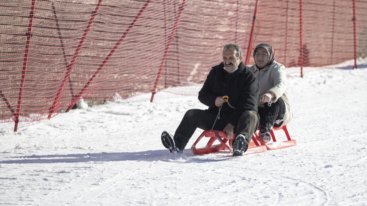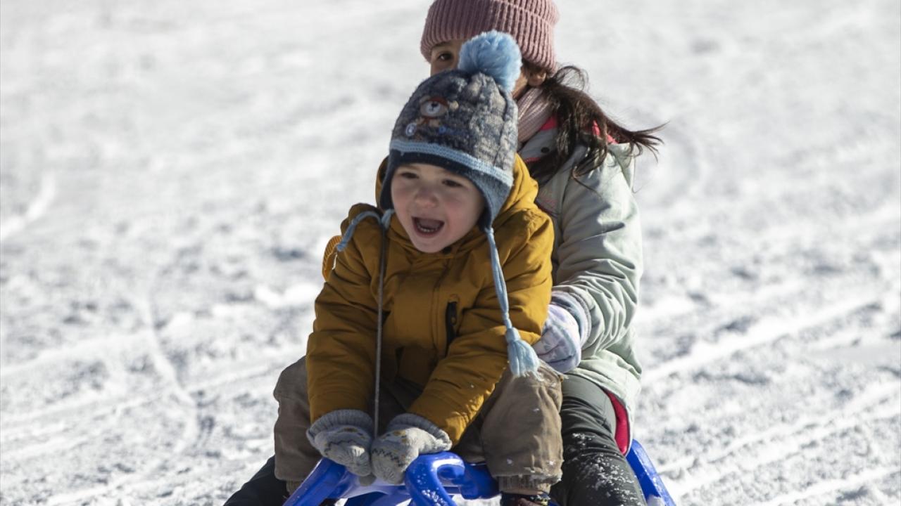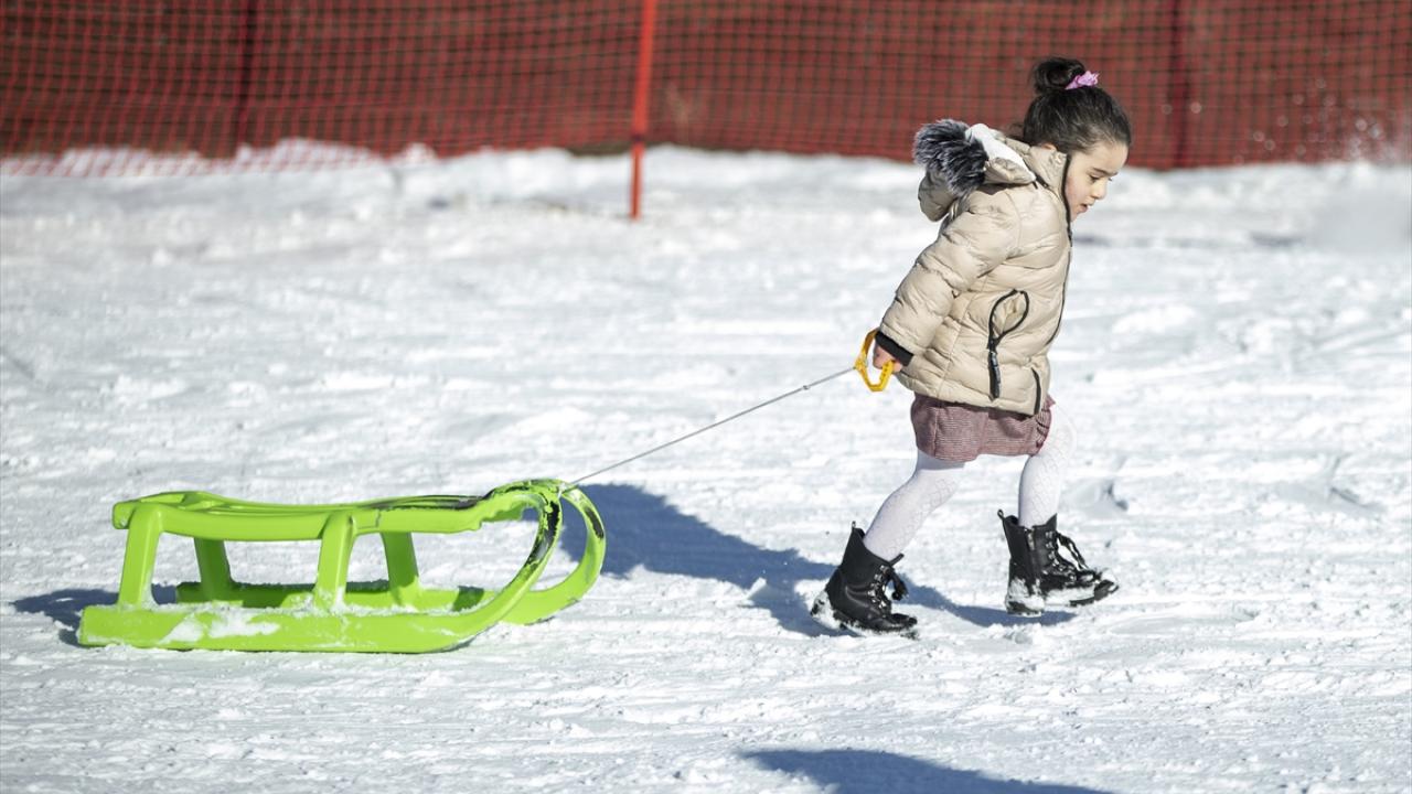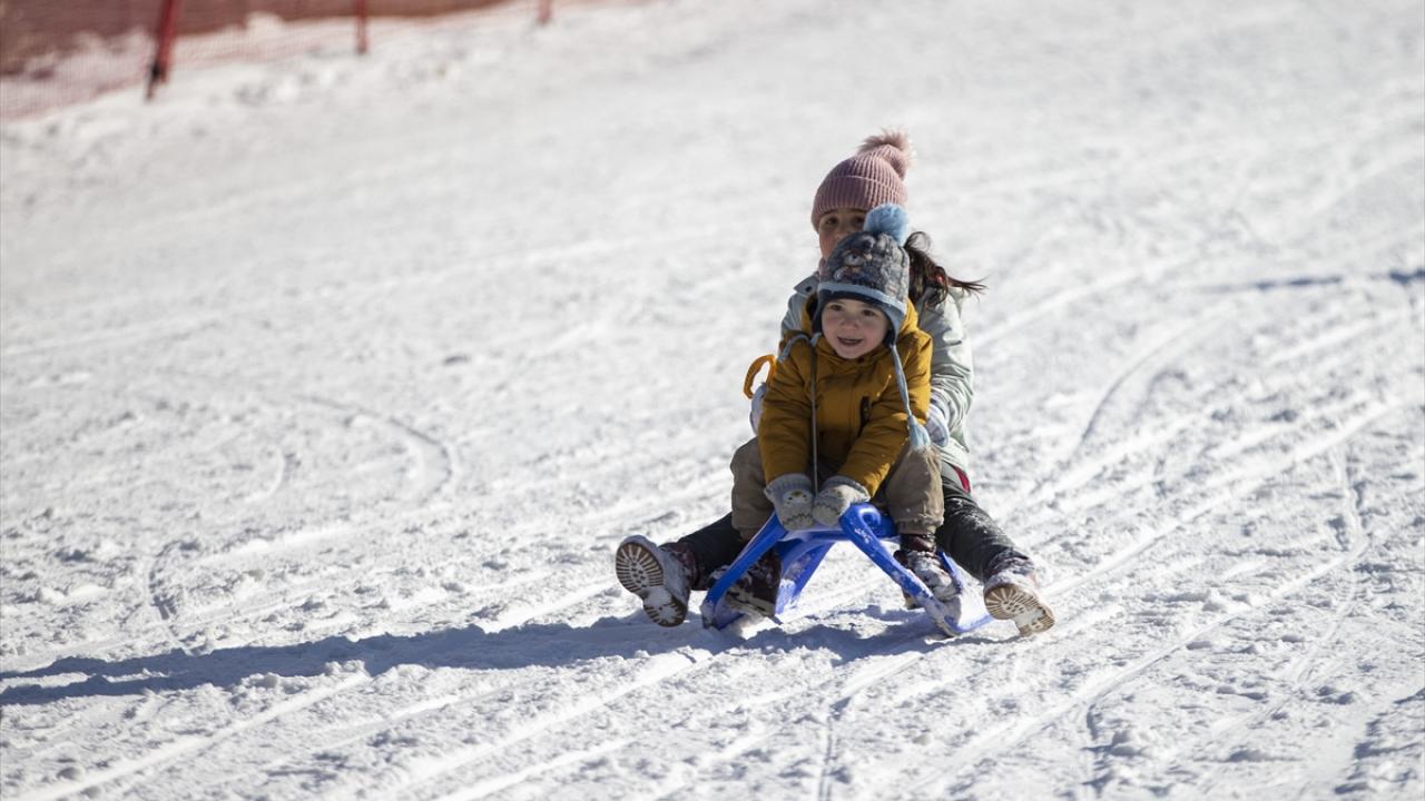 Hafta sonu tatilini merkezde geçirmek isteyen aileler de güneşli havada çocuklarıyla kızak bindi.