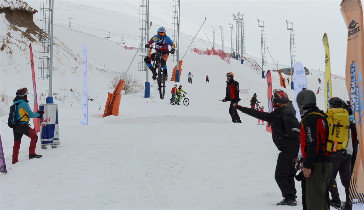 Adrenalin ve heyecan dolu dakikalar yaşayan katılımcılar, daha sonra festival alanında kardan oluşturulan bisiklet parkurunda gösteri yaptı.