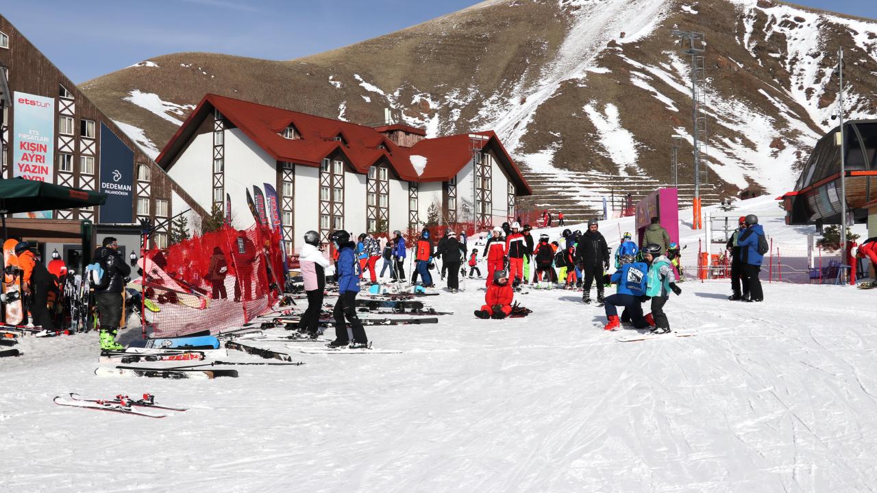 Rezervasyonların sürdüğü merkeze gelen turistler, güneşli havada kayak yapıyor.