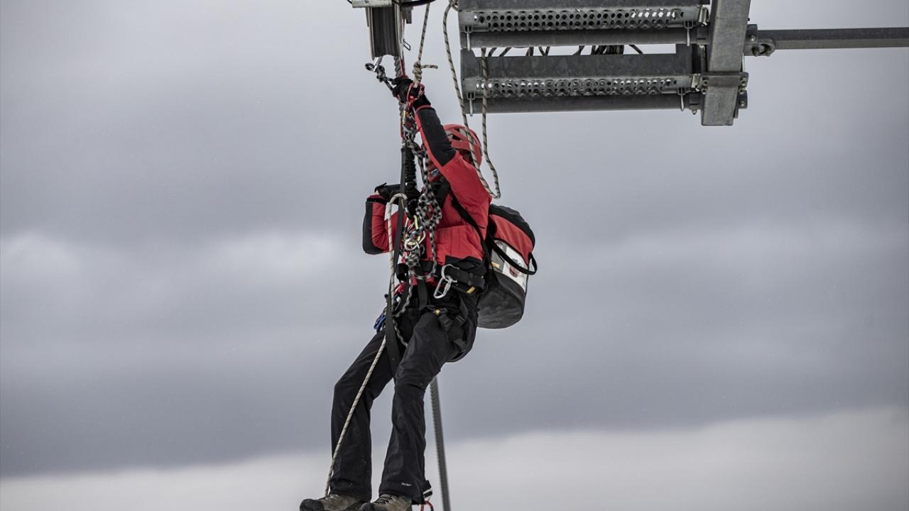 Halat bağladıkları 46 metre yükseklikteki telesiyeje çıkan timler, konuşarak sakinleştirdikleri turisti güvenle yere indirdi.