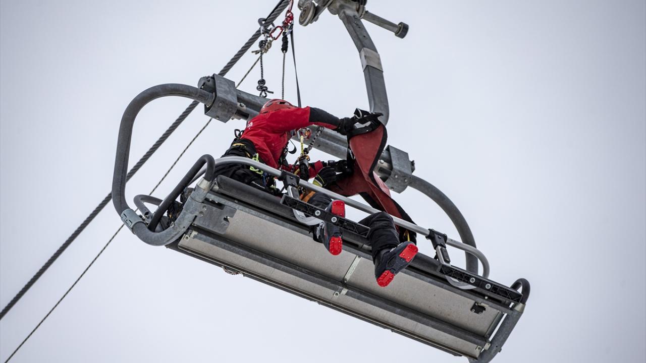 Ekipler, senaryo gereği 2 bin 900 rakımdaki kuzey ile güney pistinin kesiştiği alandaki telesiyejde mahsur kalan bir kayakçıyı kurtarmak için harekete geçti.