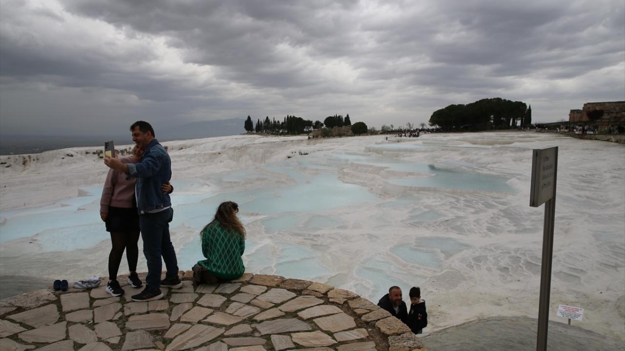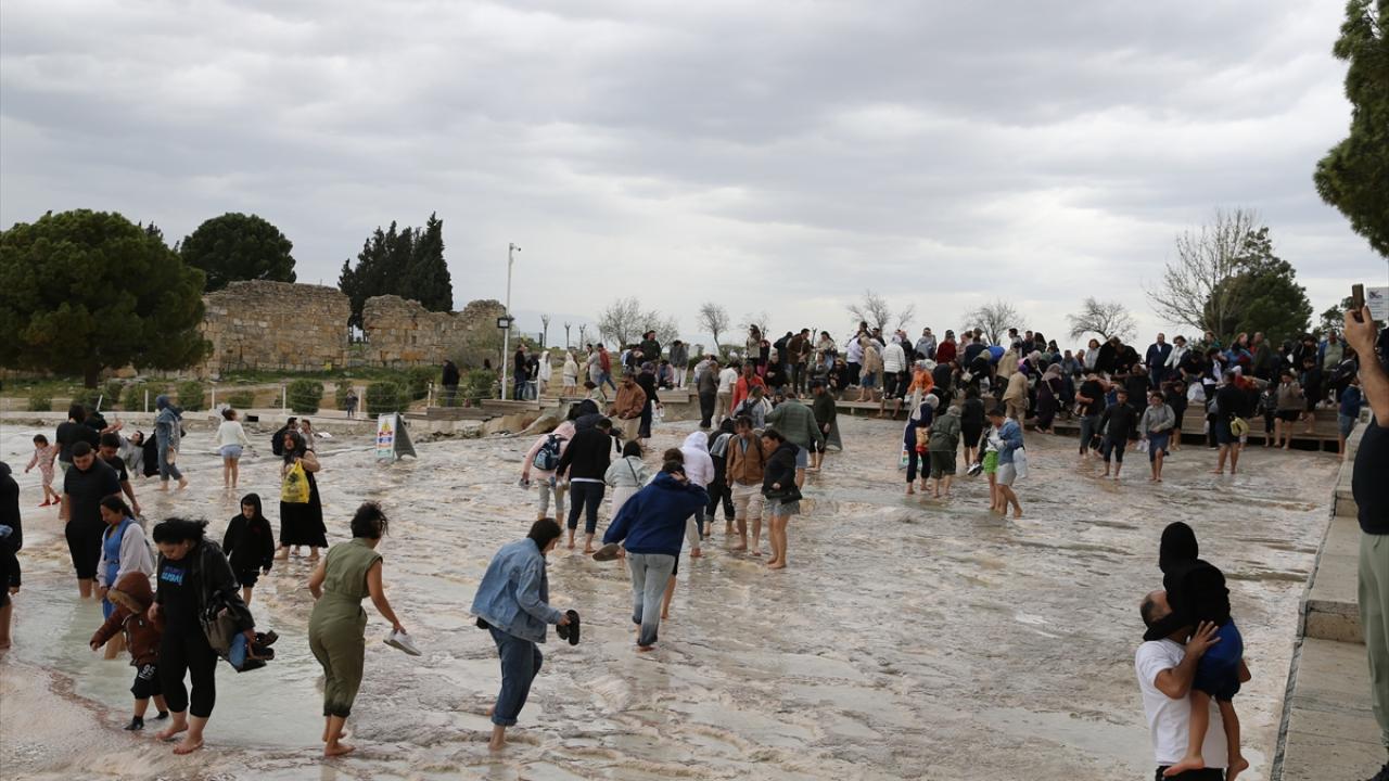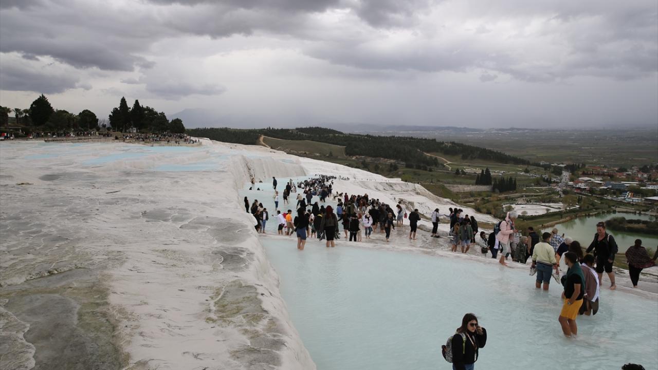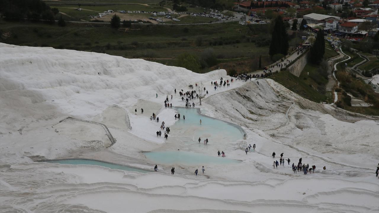 Çoğunluğu yerli misafirler, beyaz travertenler üzerinde yürüyüp hatıra fotoğrafı çekti. Ören yerindeki antik kenti de gezen tatilciler, zaman zaman etkili olan yağışa rağmen giriş kapılarında kuyruk oluşturdu.