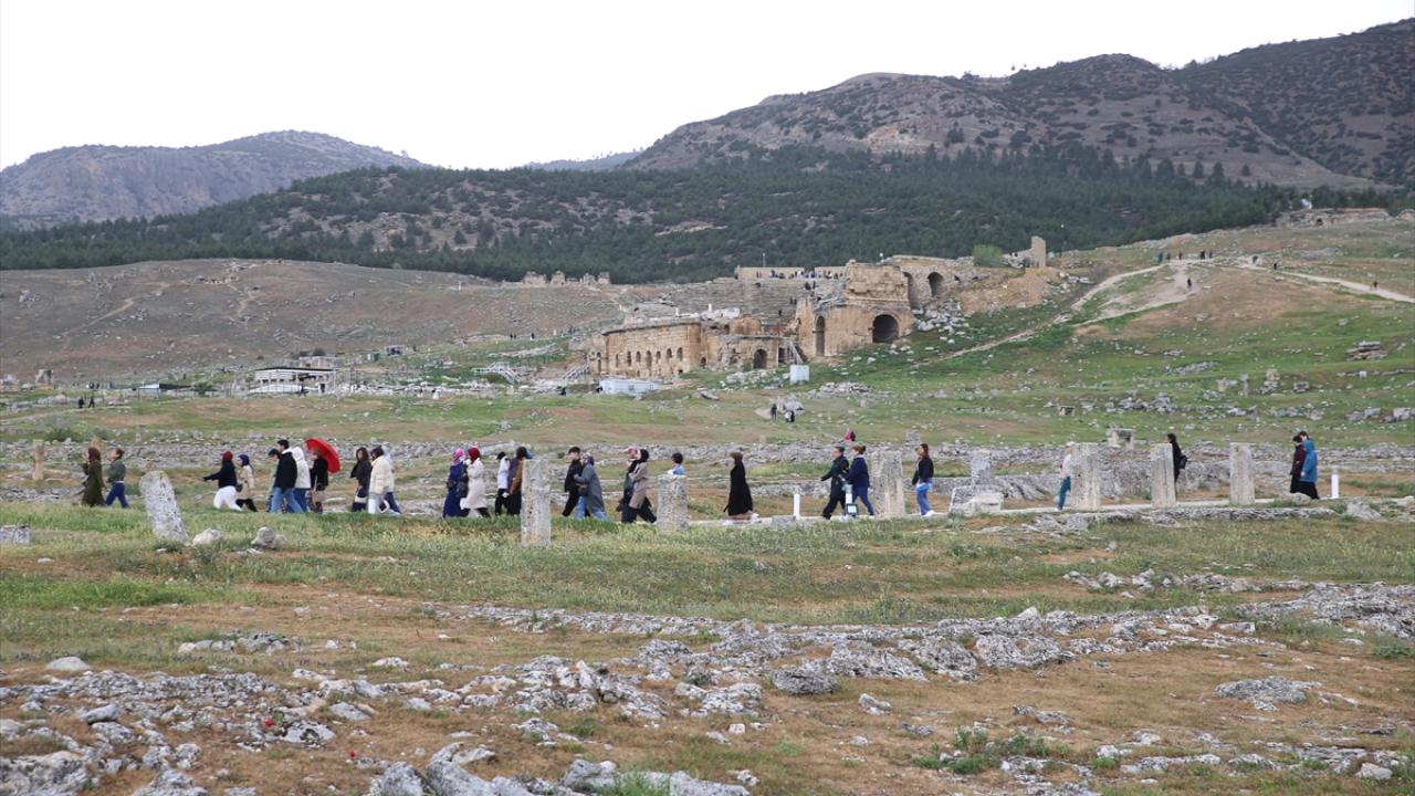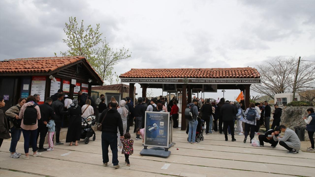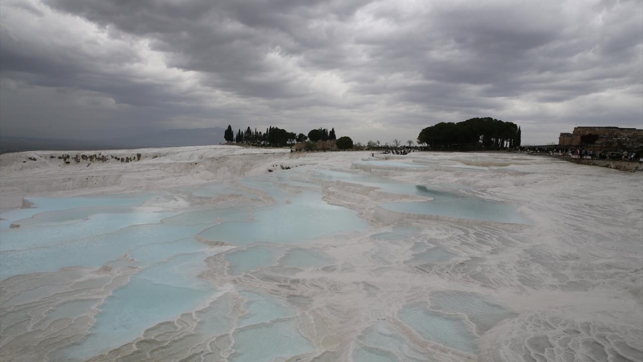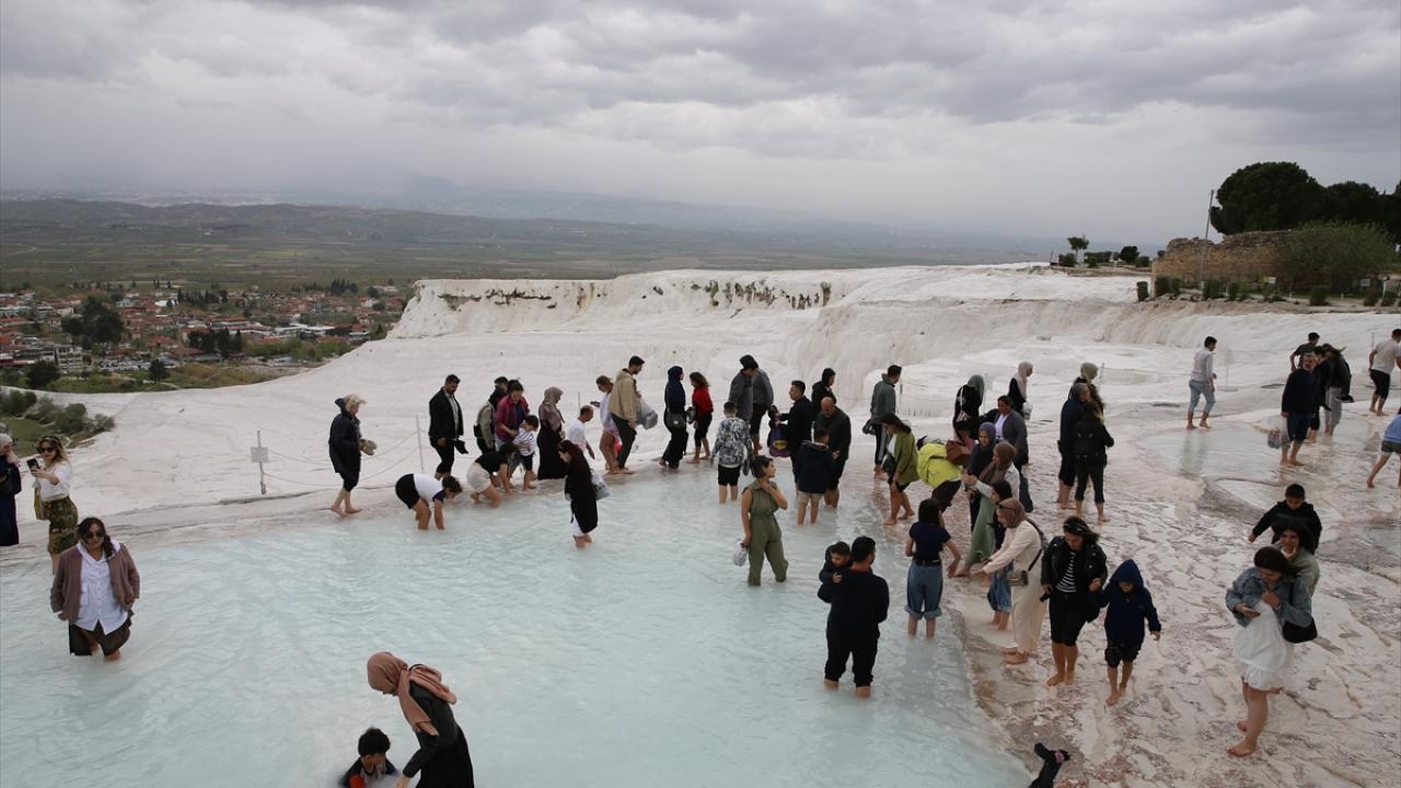Çoğunluğu yerli misafirler, beyaz travertenler üzerinde yürüyüp hatıra fotoğrafı çekti. Ören yerindeki antik kenti de gezen tatilciler, zaman zaman etkili olan yağışa rağmen giriş kapılarında kuyruk oluşturdu.