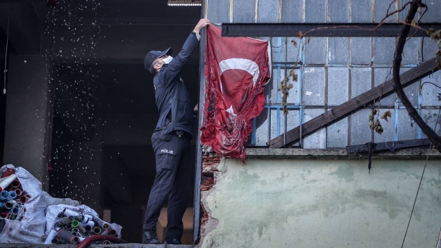 Yangında zarar gören Türk bayrağını polis ekipleri koruma altına aldı