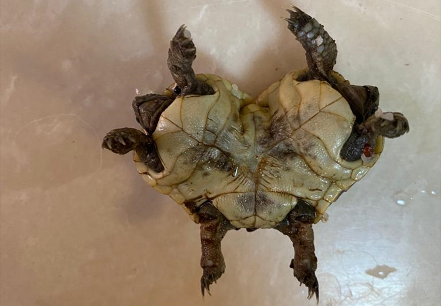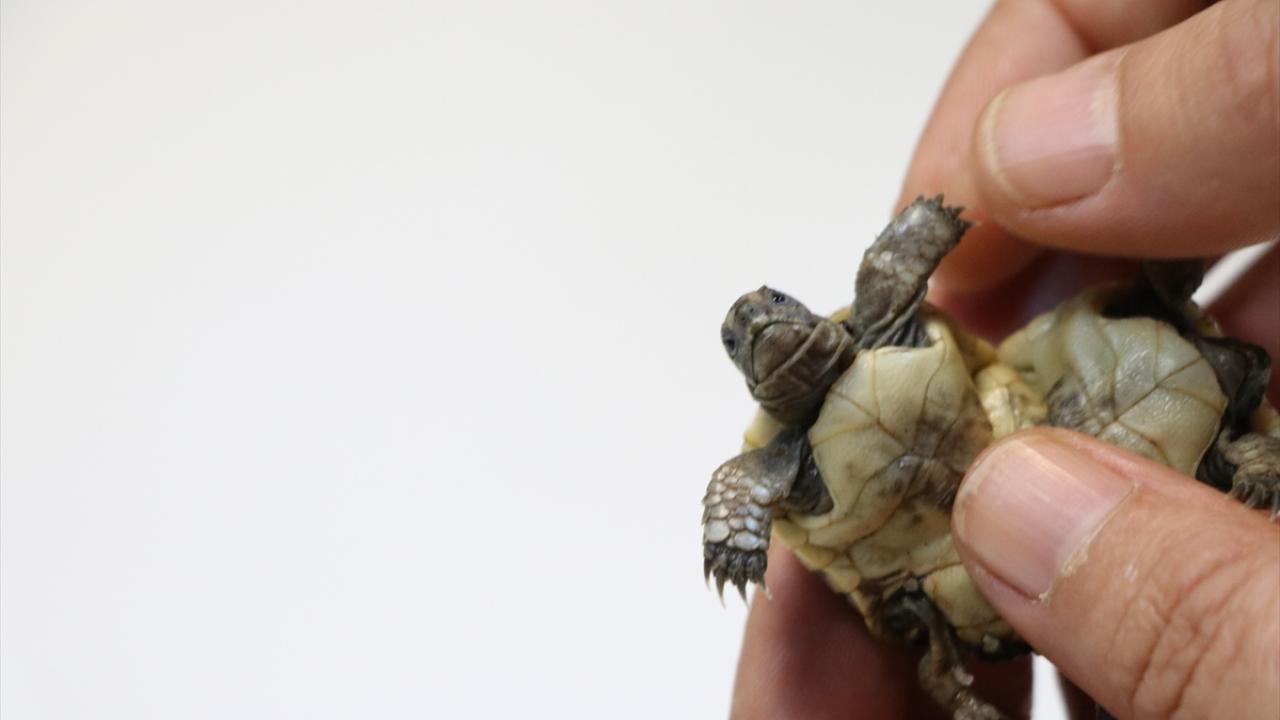 "Yakından baktığımızda bu türün siyam ikizi olduğunu da görebiliyoruz. Biraz daha detaylı bakınca mide kısmından başlamak üzere sindirim sisteminin tek bir açıkla dışarıya çıktığını görüyoruz. Aynı şekilde arka bacaklarda tek bir bireye aitmiş gibi görünüyor. Böyle bir türün doğada yaşaması çok zor. Biz de bu siyam ikizi kaplumbağaları laboratuvarımızda yaşatmaya çalışacağız, umarım başarılı oluruz."