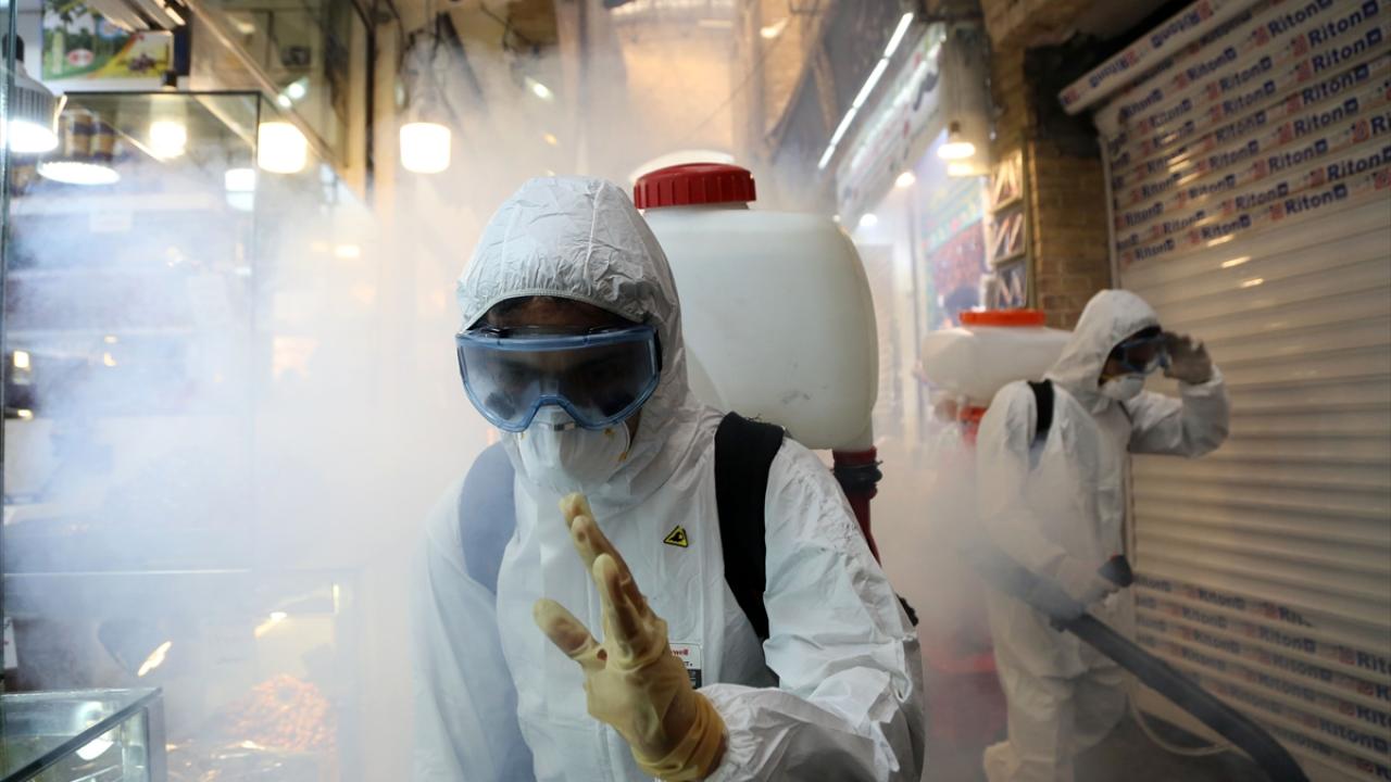 İran`ın başkenti Tahran`da koronavirüsle (Covid-19) mücadele kapsamında koruyucu kıyafet giyen itfaiye ekipleri, Tecriş Çarşısı`nda dezenfeksiyon çalışması yaptı. (Arşiv)