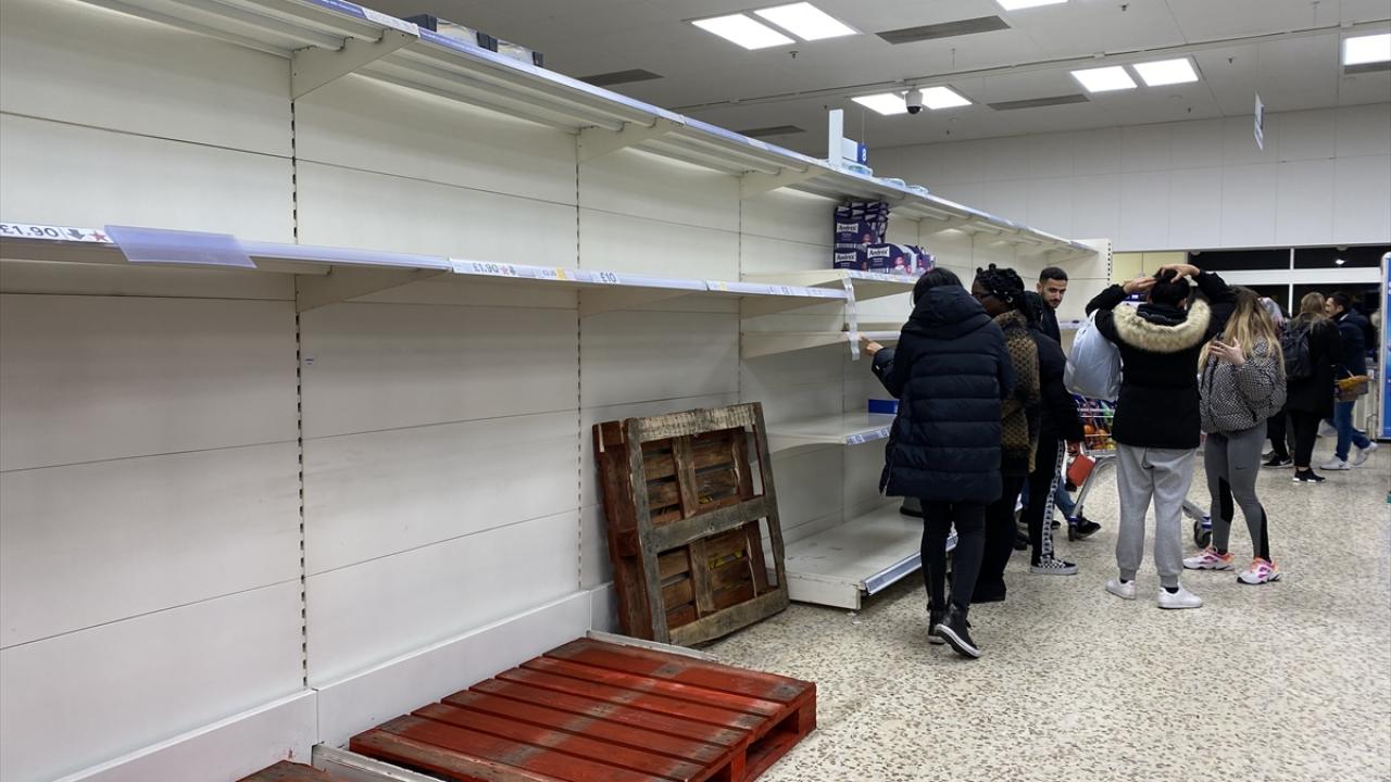 İngiltere`de yeni tip koronavirüs (Covid-19) salgınına karşı alınan önlemler nedeniyle marketlerdeki makarna ve kişisel temizlik malzemelerinin yer aldığı raflarda ürünlerin tükendiği görüldü. (Arşiv)