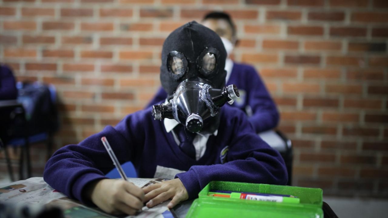 Güney Amerika ülkesi Kolombiya’nın Soacha kentindeki bir okulda öğrenciler, yeni tip koronavirüs (Covid-19) salgınına tedbir olarak ev yapımı maskelerle eğitimlerine devam ediyor. (Arşiv)