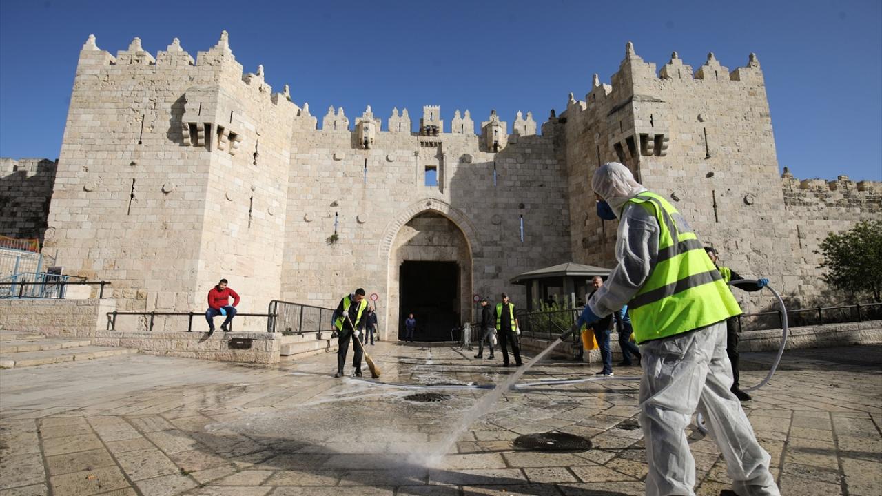 Kudüs`te bir grup gönüllü, yeni tip koronavirüs (Covid-19) tedbirleri kapsamında Eski Şehir bölgesinde yer alan Şam Kapısı ve çevresinde dezenfeksiyon çalışması gerçekleştirdi. (Arşiv)
