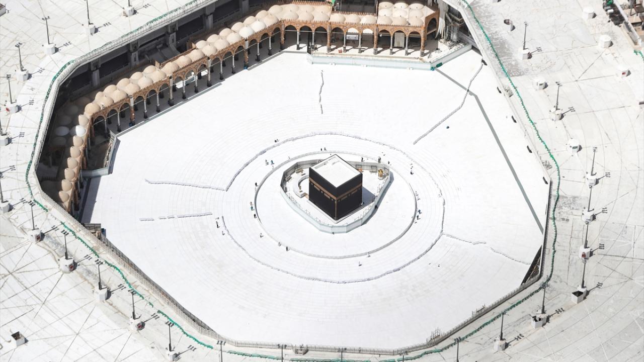 Suudi Arabistan, Covid-19`la mücadele kapsamında, 2 Mart`tan itibaren dünya genelinden umre ziyaretlerini, 20 Mart`tan itibaren de Mekke`deki Harem-i Şerif ve Medine`deki Mescid-i Nebevi`ye ziyareti durdurdu. Alınan kararın ardından, Kabe`nin etrafında sadece görevliler bulundu. (Arşiv)