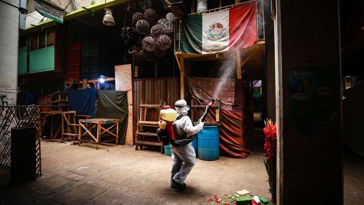 Anneler Günü öncesinde, Meksika`nın başkenti Meksiko`da bulunan geleneksel Jaimaica çiçek pazarında yeni tip koronavirüse (Covid-19) karşı alınan tedbirler kapsamında dezenfekte çalışmaları yapıldı. (Arşiv)