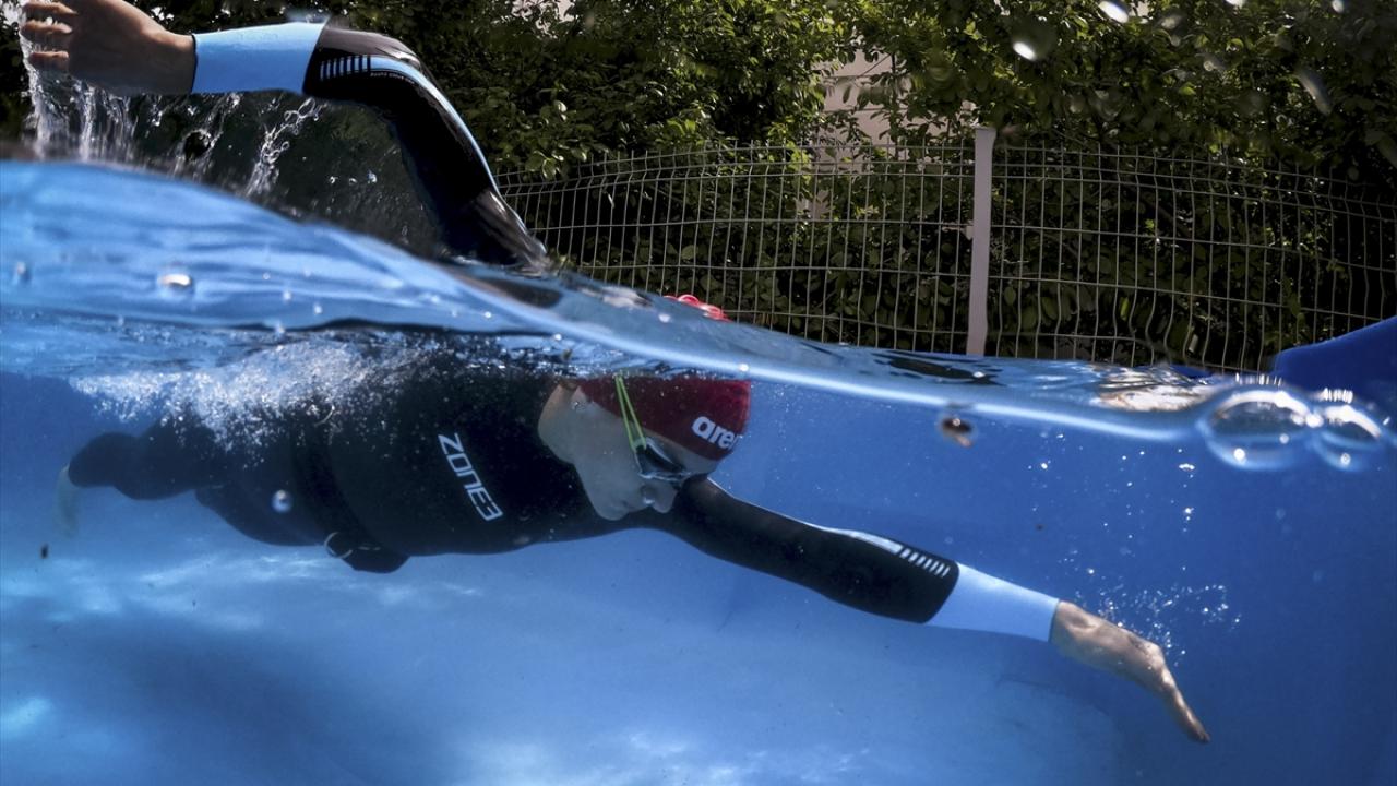 Eski milli triatlet Pınar Avşar, yeni tip koronavirüs (Covid-19) nedeniyle kondisyon kaybının önüne geçmek için antrenmanlarını evinin bahçesine kurduğu portatif havuzda yaptı. (Arşiv)